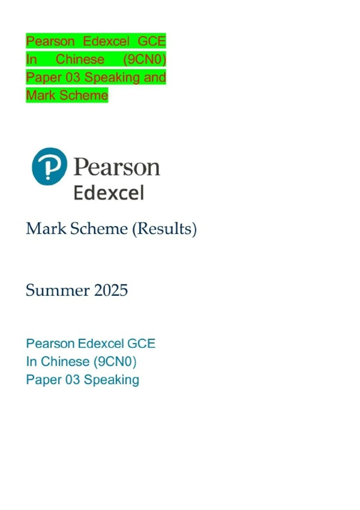 Pearson Edexcel GCE In Chinese (9CN0) Paper 03 Speaking and Mark Scheme