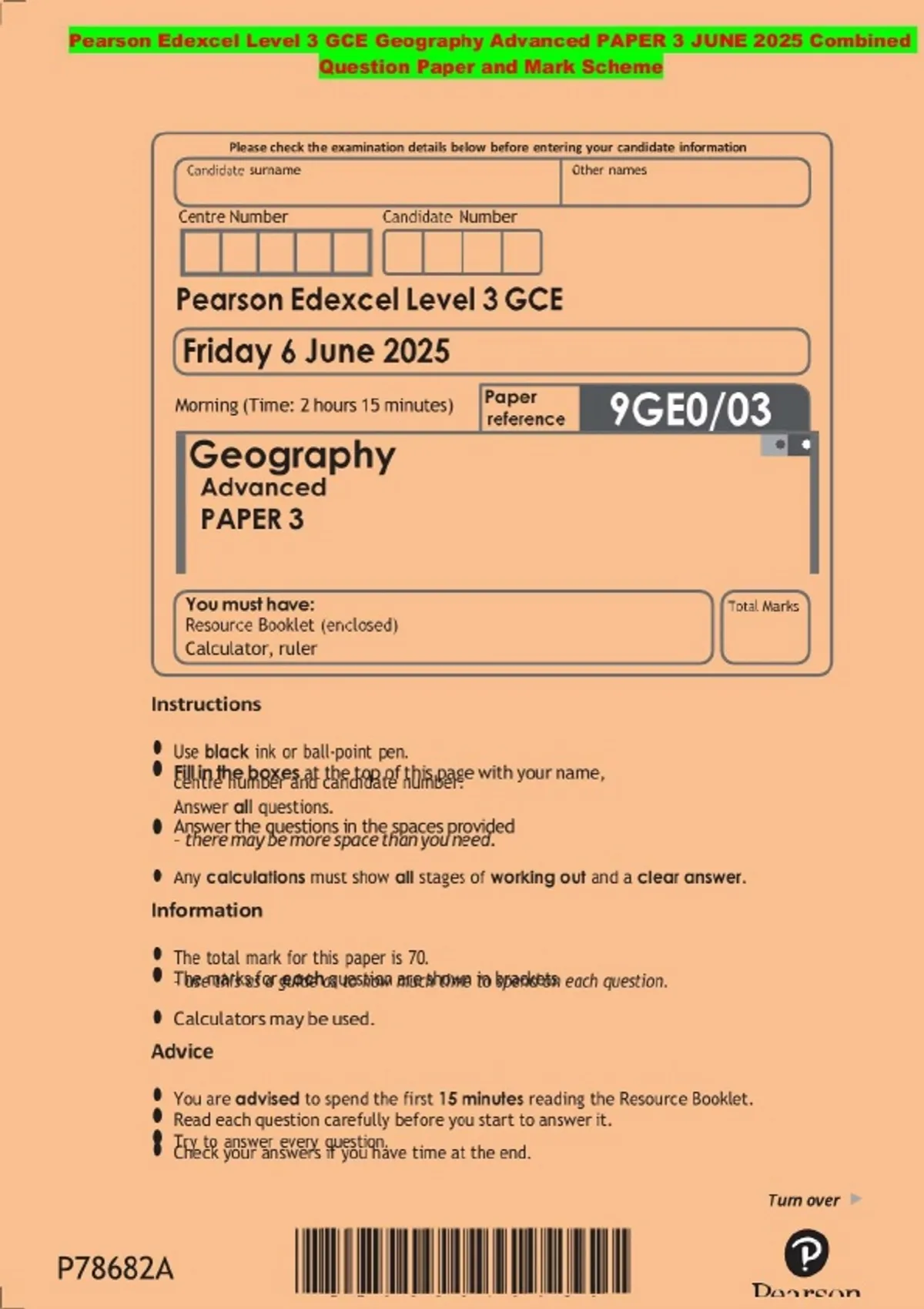 Pearson Edexcel Level 3 GCE Geography Advanced PAPER 3 JUNE 2025 Combined Question Paper and Mark Scheme