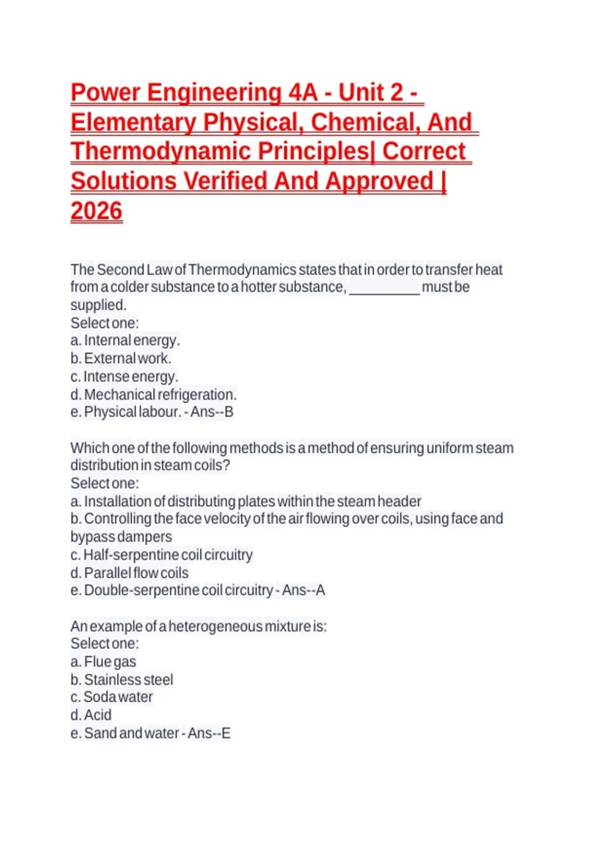 Power Engineering 4A - Unit 2 - Elementary Physical, Chemical, And Thermodynamic Principles| Correct Solutions Verified And Approved |2026