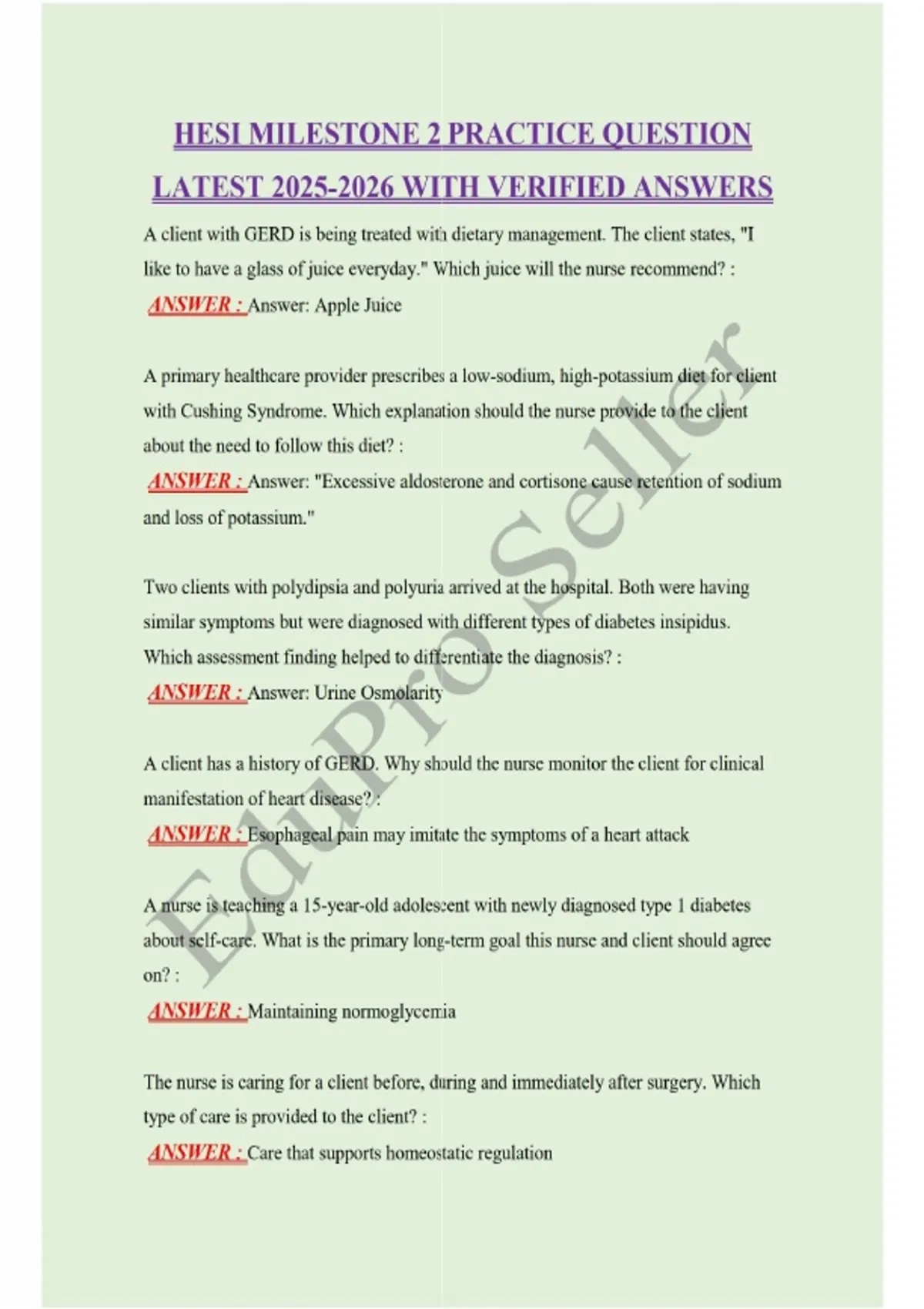 HESI MILESTONE 2 PRACTICE QUESTION LATEST WITH VERIFIED ANSWERS