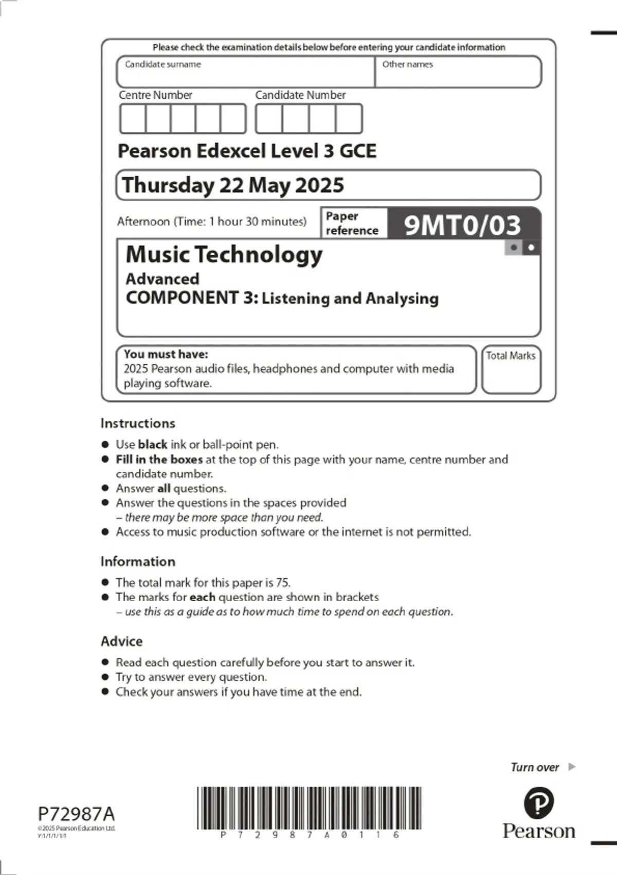2025 Pearson Edexcel Level 3 GCE Music Technology Advanced COMPONENT 3: Listening and Analysing Combined Question Paper & Final Marking Scheme