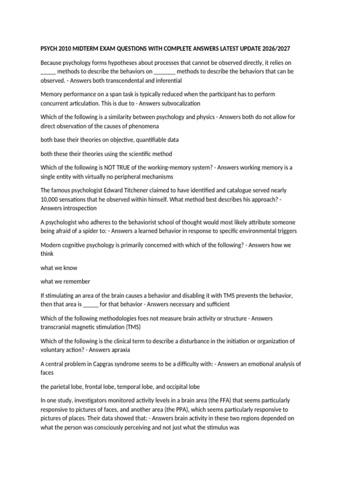 PSYCH 2010 MIDTERM EXAM QUESTIONS WITH COMPLETE ANSWERS LATEST UPDATE 2026/2027 Because psychology forms hypotheses about processes that cannot be observed directly, it relies on _____ methods to describe the behaviors on _______ methods to describe the behaviors that can be observed. - Answers both transcendental and inferential Memory performance on a span task is typically reduced when the participant has to perform concurrent articulation. This is due to - Answers subvocalization Which of the following is a similarity between psychology and physics - Answers both do not allow for direct observation of the causes of phenomena both base their theories on objective, quantifiable data both these their theories using the scientific method Which of the following is NOT TRUE of the working-memory system? - Answers working memory is a single entity with virtually no peripheral mechanisms The famous psychologist Edward Titchener claimed to have identified and catalogue served nearly 10,000 sensations that he observed within himself. What method best describes his approach? - Answers introspection A psychologist who adheres to the behaviorist school of thought would most likely attribute someone being afraid of a spider to: - Answers a learned behavior in response to specific environmental triggers Modern cognitive psychology is primarily concerned with which of the following? - Answers how we think what we know what we remember If stimulating an area of the brain causes a behavior and disabling it with TMS prevents the behavior, then that area is _____ for that behavior - Answers necessary and sufficient Which of the following methodologies foes not measure brain activity or structure - Answers transcranial magnetic stimulation (TMS) Which of the following is the clinical term to describe a disturbance in the initiation or organization of voluntary action? - Answers apraxia A central problem in Capgras syndrome seems to be a difficulty with: - Answers an emotional analysis of faces the parietal lobe, frontal lobe, temporal lobe, and occipital lobe In one study, investigators monitored activity levels in a brain area (the FFA) that seems particularly responsive to pictures of faces, and another area (the PPA), which seems particularly responsive to pictures of places. Their data showed that: - Answers brain activity in these two regions depended on what the person was consciously perceiving and not just what the stimulus was Many subcortical structures, such as the hippocampus and amygdala, come in groups of two. Why? - Answers it has to do with lateralization The word banana appears on the left screen, and the spilt-brain patient is told to use her left hand to select the object named on the screen. Will she be able to fetch the banana? - Answers Yes The word banana appears on the left screen, and the spilt-brain patient is told to use her right hand to select the object named on the screen. Will she able to fetch the banana - Answers No The word banana appears on the right screen, and the spilt-brain patient is told house