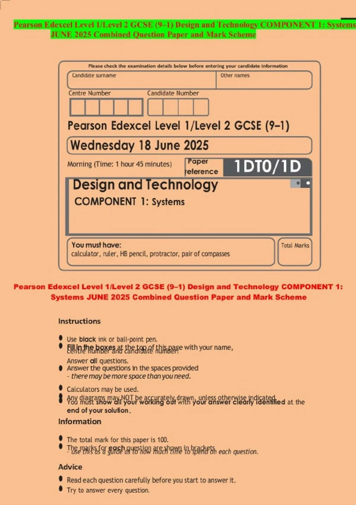 Pearson Edexcel Level 1/Level 2 GCSE (9–1) Design and Technology COMPONENT 1: Systems JUNE 2025 Combined Question Paper and Mark Scheme