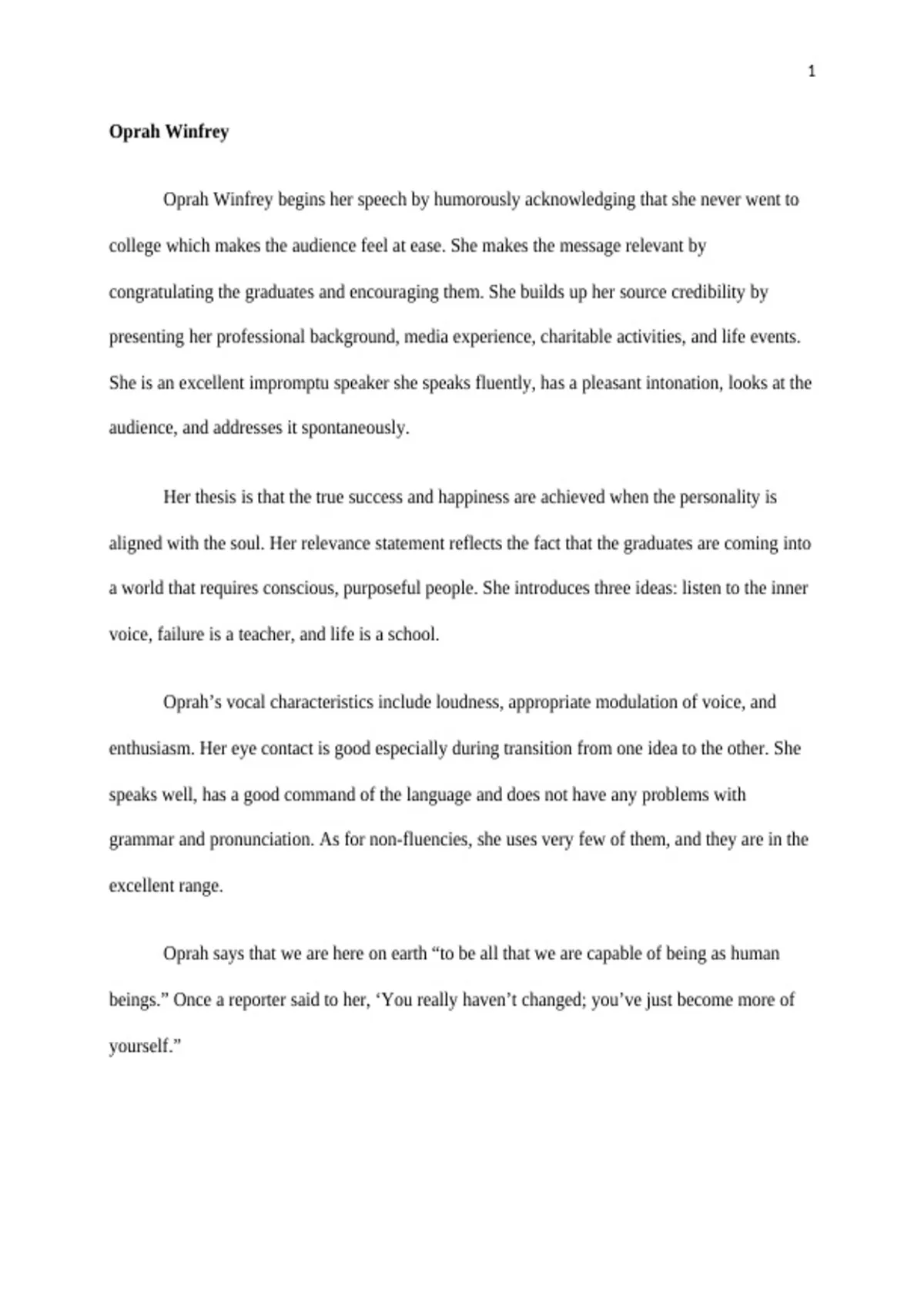 OUTSIDE SPEAKER CRITIQUE – Oprah Winfrey View the speech entitled, “Oprah Winfrey's 2008 Stanford Commencement Address” at this link: The clip is 29:54 in length. After viewing the entire clip, answer the following questions. 1) Open with Impact Open with Impact = What did Oprah do to connect with and make the speech relevant to the audience? Source Credibility = How did she establish her credibility? Extemporaneous delivery = Used authoritative tone, immediacy, continuous eye contact, interaction? 2) Thesis and Preview Thesis = What was it? Relevance statement = What was it? Preview = What are the 3 points? 3) Extemporaneous Delivery How did she do with the following? Authoritative = Used volume variety, slow rate, Eye contact = Created continuous, maintained during signposting Language = Pronunciation, grammar, articulation = excellent, satisfactory, unsatisfactory Non-fluencies = 2-4 excellent, 5-10 Satisfactory, 11 + unsatisfactory 4) Why does Oprah think we are here on this Earth? 5) Fill in the blank for what the reporter said to Oprah: “You really haven’t changed, you’ve just .” 6) What is the most impactful part of the speech for you? How might you apply her advice to your life? 7) How did she create Pathos? 8) How did she create Ethos? 9) How did she create Logos?