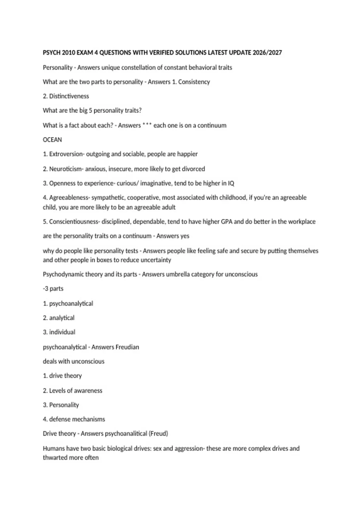 PSYCH 2010 EXAM 4 QUESTIONS WITH VERIFIED SOLUTIONS LATEST UPDATE 2026/2027 Personality - Answers unique constellation of constant behavioral traits What are the two parts to personality - Answers 1. Consistency 2. Distinctiveness What are the big 5 personality traits? What is a fact about each? - Answers *** each one is on a continuum OCEAN 1. Extroversion- outgoing and sociable, people are happier 2. Neuroticism- anxious, insecure, more likely to get divorced 3. Openness to experience- curious/ imaginative, tend to be higher in IQ 4. Agreeableness- sympathetic, cooperative, most associated with childhood, if you're an agreeable child, you are more likely to be an agreeable adult 5. Conscientiousness- disciplined, dependable, tend to have higher GPA and do better in the workplace are the personality traits on a continuum - Answers yes why do people like personality tests - Answers people like feeling safe and secure by putting themselves and other people in boxes to reduce uncertainty Psychodynamic theory and its parts - Answers umbrella category for unconscious -3 parts 1. psychoanalytical 2. analytical 3. individual psychoanalytical - Answers Freudian deals with unconscious 1. drive theory 2. Levels of awareness 3. Personality 4. defense mechanisms Drive theory - Answers psychoanalitical (Freud) Humans have two basic biological drives: sex and aggression- these are more complex drives and thwarted more often levels of awareness and personality terms and definitions - Answers Psychoanalytical (Freud) Conscious- aware at any one point preconscious- not aware at any one point but easily accessible Ex: kindergarten teachers face Unconscious- thoughts, memories, drives below the surface (hostility, trauma, repressed memories) Ego- reality principle Id- pleasure principle, instinct component superego- referee, moral component levels of awareness and personality - Answers conscious. ego. | -----------------------------|------------------ preconscious. | | Id. | Superego | | unconscious. | What did Freud think caused anxiety - Answers Unconscious conflict- id, ego, and superego in conflict with each other Defense mechanisms - Answers Psychonalytical (Freud) 1. denail 2. repression 3. projection 4. reaction formation 5. regression 6. rationalization