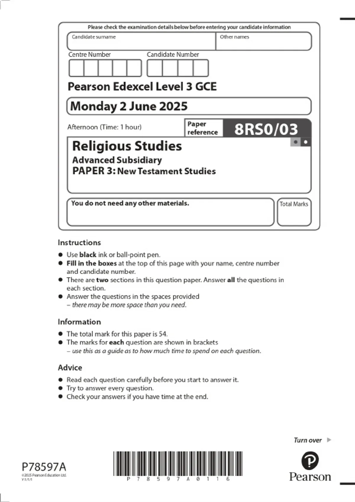 2025 Pearson Edexcel Level 3 GCE Religious Studies Advanced Subsidiary PAPER 3: New Testament Studies Combined Question Paper & Final Marking Scheme