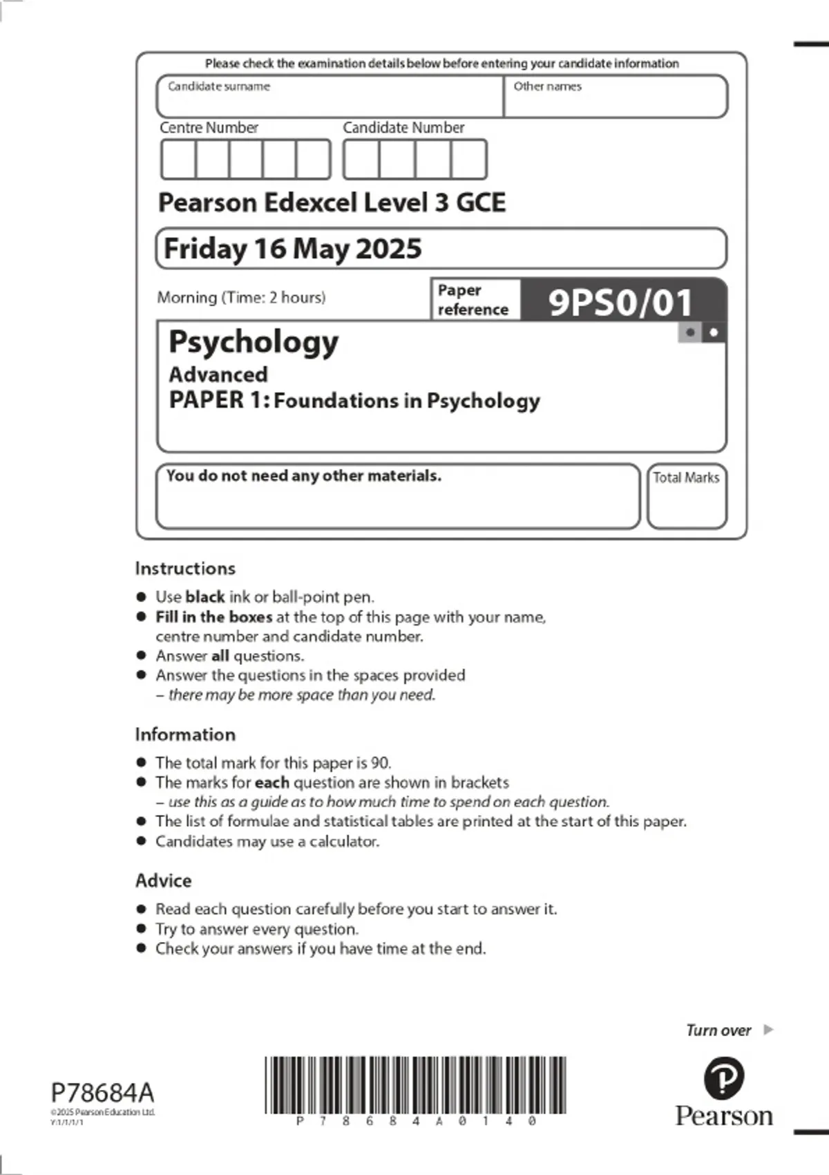 2025 Pearson Edexcel Level 3 GCE Psychology Advanced PAPER 1: Foundations in Psychology Combined Question Paper & Final Marking Scheme