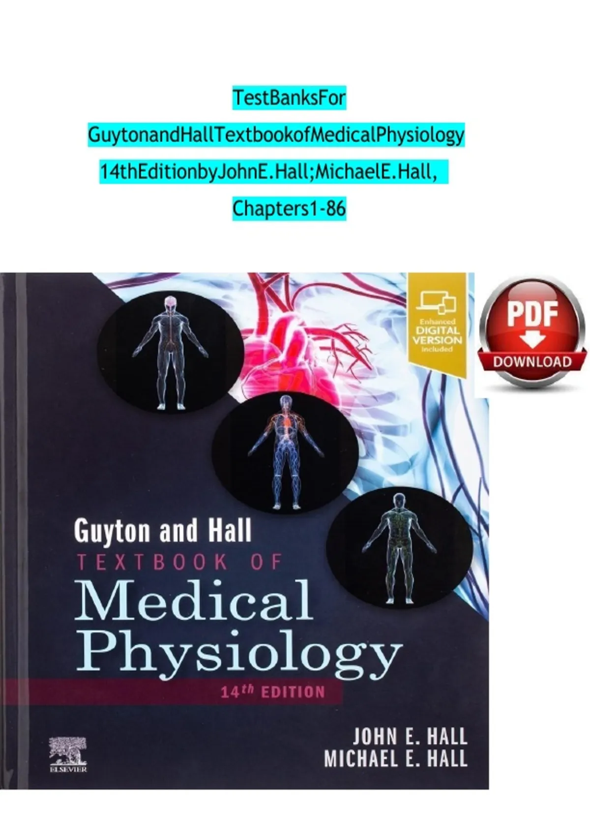 This Test Bank for Guyton and Hall Textbook of Medical Physiology, 14th Edition by John E. Hall and Michael E. Hall provides complete and structured exam preparation for U.S. medical, nursing, PA, and health science students. The document includes verified practice questions and answers covering Chapters 1–86, spanning all major physiological systems. Topics covered include cellular physiology, membrane transport, neurophysiology, cardiovascular regulation, respiratory physiology, renal and acid–base balance, gastrointestinal physiology, endocrine control, metabolism, reproduction, and integrative homeostasis. Designed for quizzes, block exams, midterms, finals, and board-style assessments, this test bank aligns with U.S. medical education standards and supports deep conceptual understanding. Professionally organized and exam-focused, this resource is curated by testbankdepotx to help students study efficiently and perform confidently. Ideal for students searching for Guyton and Hall physiology test bank chapters 1–86, medical physiology exam prep 2025/2026, and U.S. physiology practice questions. Guyton and Hall medical physiology 14th edition test bank Medical physiology test bank chapters 1–86 Physiology exam practice questions USA Guyton Hall physiology quiz and exam prep Nursing and medical physiology test bank Pre-med physiology practice questions Physiology midterm and final exam prep