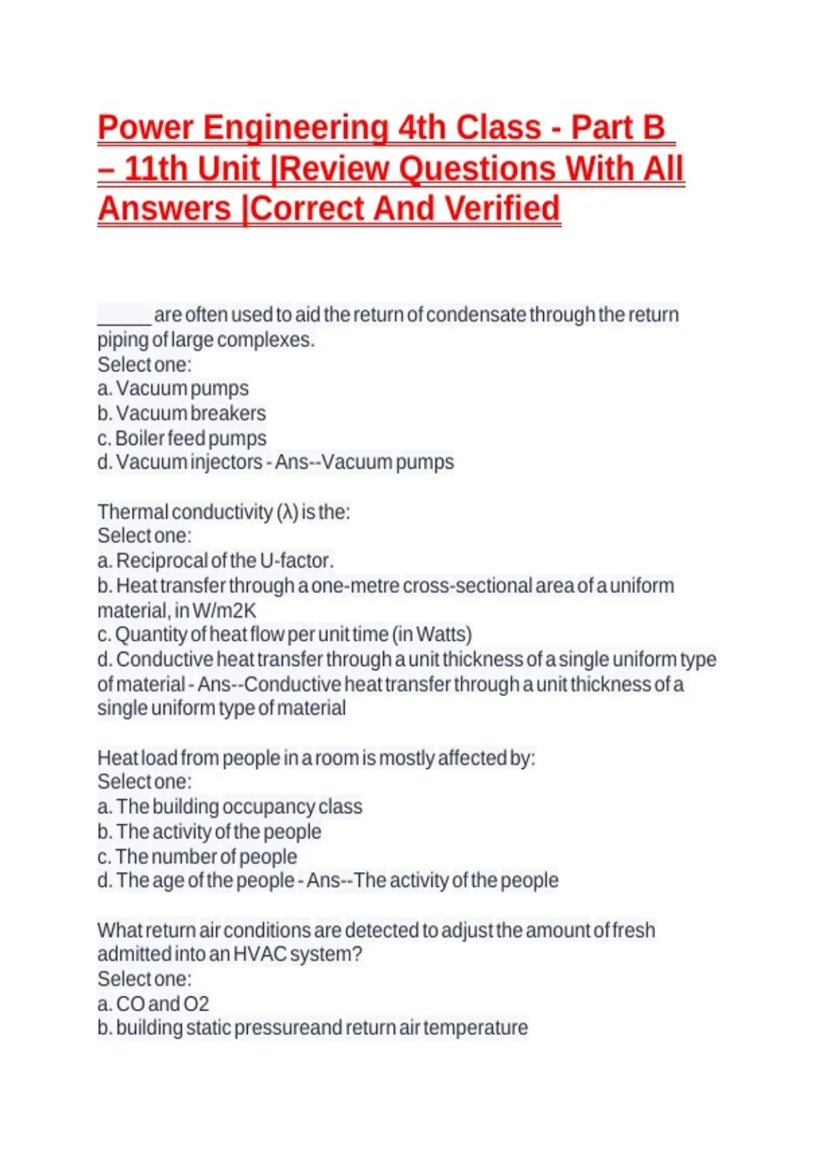 Power Engineering 4th Class - Part B – 11th Unit |Review Questions With All Answers |Correct And Verified