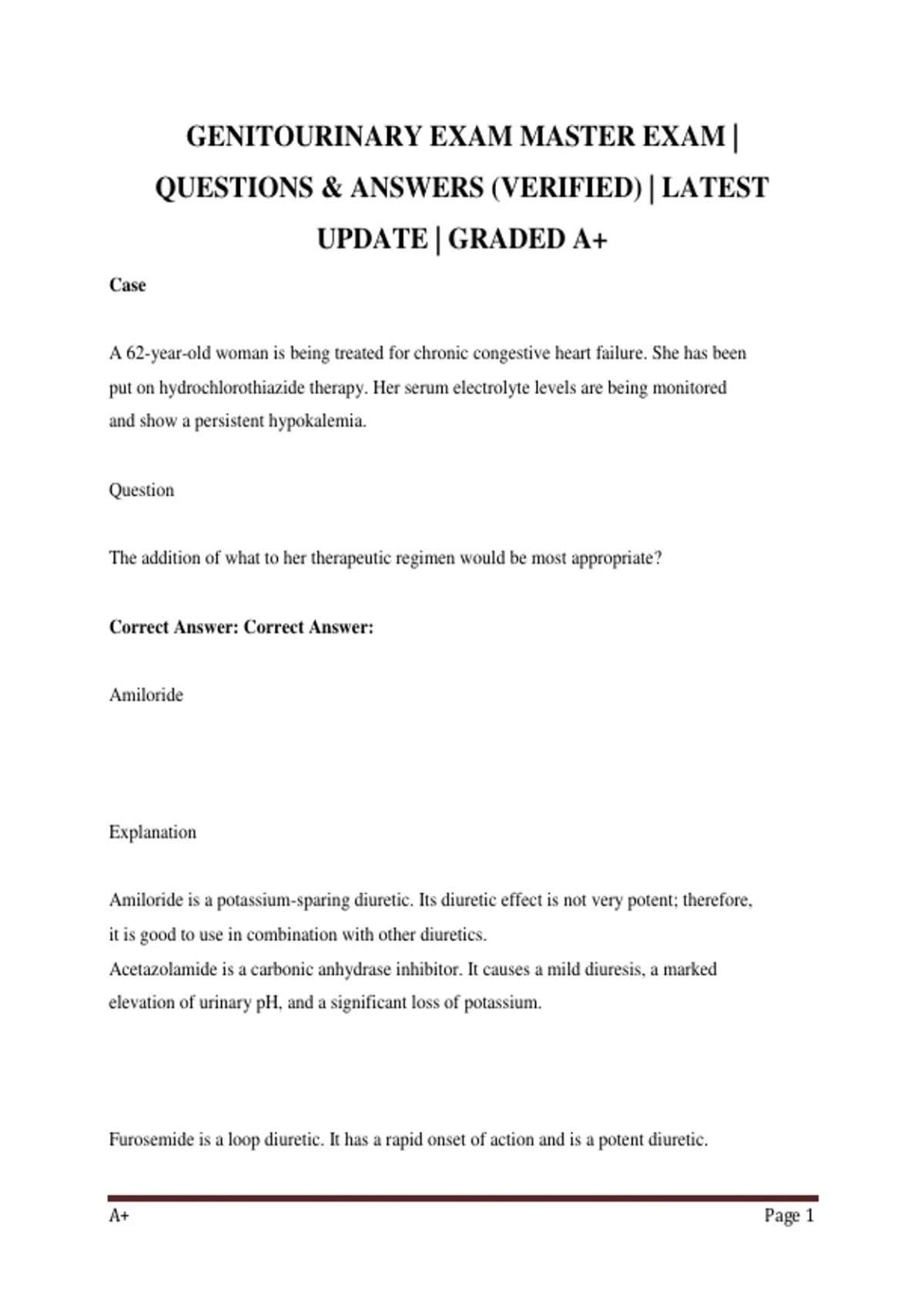 Prepare effectively for Genitourinary (GU) exams with this Master Exam Questions and Answers Package with Verified Solutions updated 2025/2026, a comprehensive study resource for nursing students and healthcare professionals. This package includes exam-style questions with detailed, step-by-step solutions, covering essential topics such as anatomy and physiology of the urinary system, renal disorders, urinary tract infections, diagnostic assessments, pharmacological interventions, and evidence-based nursing care.