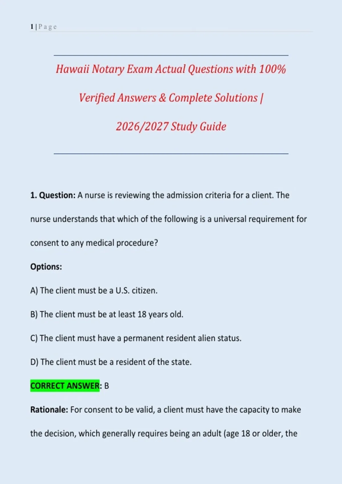 This comprehensive study guide is designed for candidates preparing for the Hawaii Notary Public Exam. It features actual exam-style questions with 100% verified answers and complete solutions, aligned with current Hawaii state notary laws, regulations, and testing standards for the 2026/2027 cycle. Ideal for individuals seeking initial notary certification or renewal in Hawaii, this resource covers essential topics including notary duties and powers, authorized acts, recordkeeping requirements, prohibited practices, legal responsibilities, and ethical standards. Each question includes clear explanations to reinforce understanding and practical application. Aligned with current Hawaii notary exam formats, this study guide supports focused review, exam readiness, and confidence-building. It is an essential tool for first-time success and professional competency as a Hawaii Notary Public.