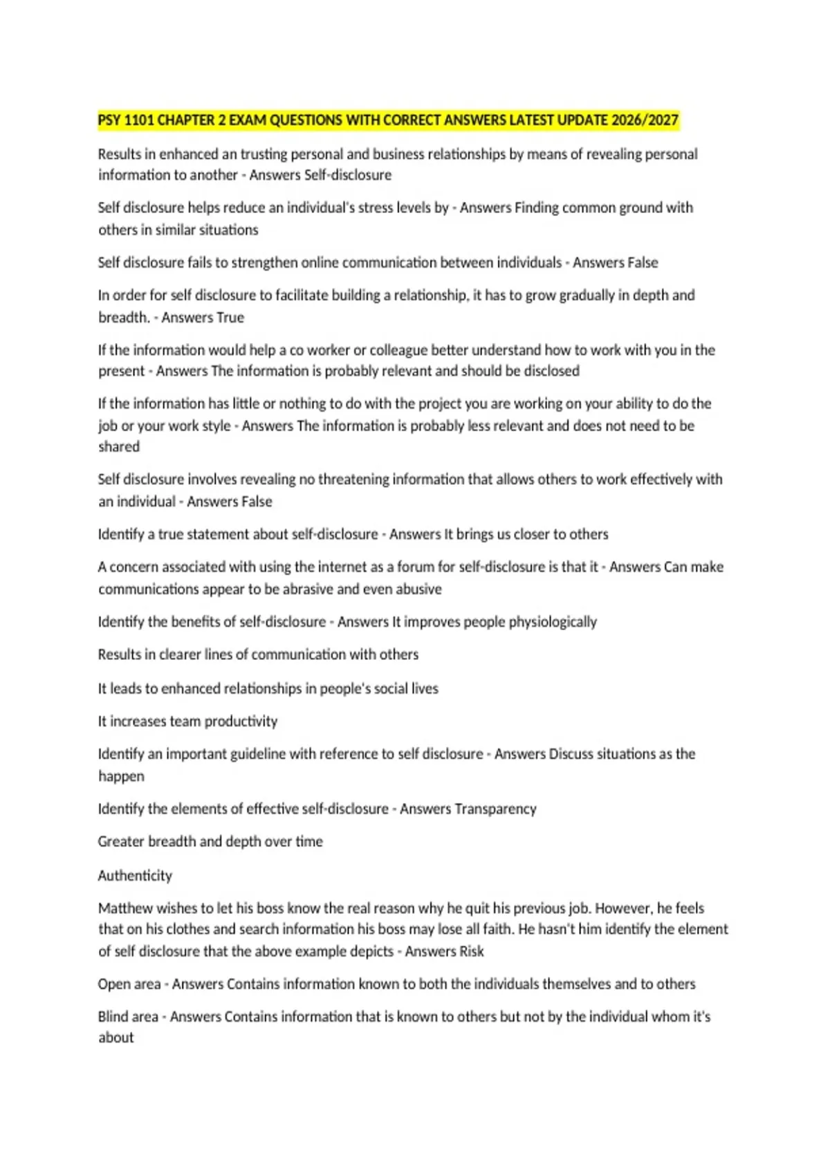 PSY 1101 CHAPTER 2 EXAM QUESTIONS WITH CORRECT ANSWERS LATEST UPDATE 2026/2027 Results in enhanced an trusting personal and business relationships by means of revealing personal information to another - Answers Self-disclosure Self disclosure helps reduce an individual's stress levels by - Answers Finding common ground with others in similar situations Self disclosure fails to strengthen online communication between individuals - Answers False In order for self disclosure to facilitate building a relationship, it has to grow gradually in depth and breadth. - Answers True If the information would help a co worker or colleague better understand how to work with you in the present - Answers The information is probably relevant and should be disclosed If the information has little or nothing to do with the project you are working on your ability to do the job or your work style - Answers The information is probably less relevant and does not need to be shared Self disclosure involves revealing no threatening information that allows others to work effectively with an individual - Answers False Identify a true statement about self-disclosure - Answers It brings us closer to others A concern associated with using the internet as a forum for self-disclosure is that it - Answers Can make communications appear to be abrasive and even abusive Identify the benefits of self-disclosure - Answers It improves people physiologically Results in clearer lines of communication with others It leads to enhanced relationships in people's social lives It increases team productivity Identify an important guideline with reference to self disclosure - Answers Discuss situations as the happen Identify the elements of effective self-disclosure - Answers Transparency Greater breadth and depth over time Authenticity Matthew wishes to let his boss know the real reason why he quit his previous job. However, he feels that on his clothes and search information his boss may lose all faith. He hasn't him identify the element of self disclosure that the above example depicts - Answers Risk Open area - Answers Contains information known to both the individuals themselves and to others