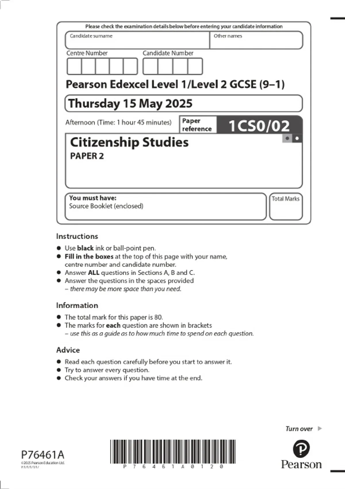 2025 Pearson Edexcel Level 1/Level 2 GCSE (9–1) Citizenship Studies PAPER 2 Combined Question Paper & Marking Scheme