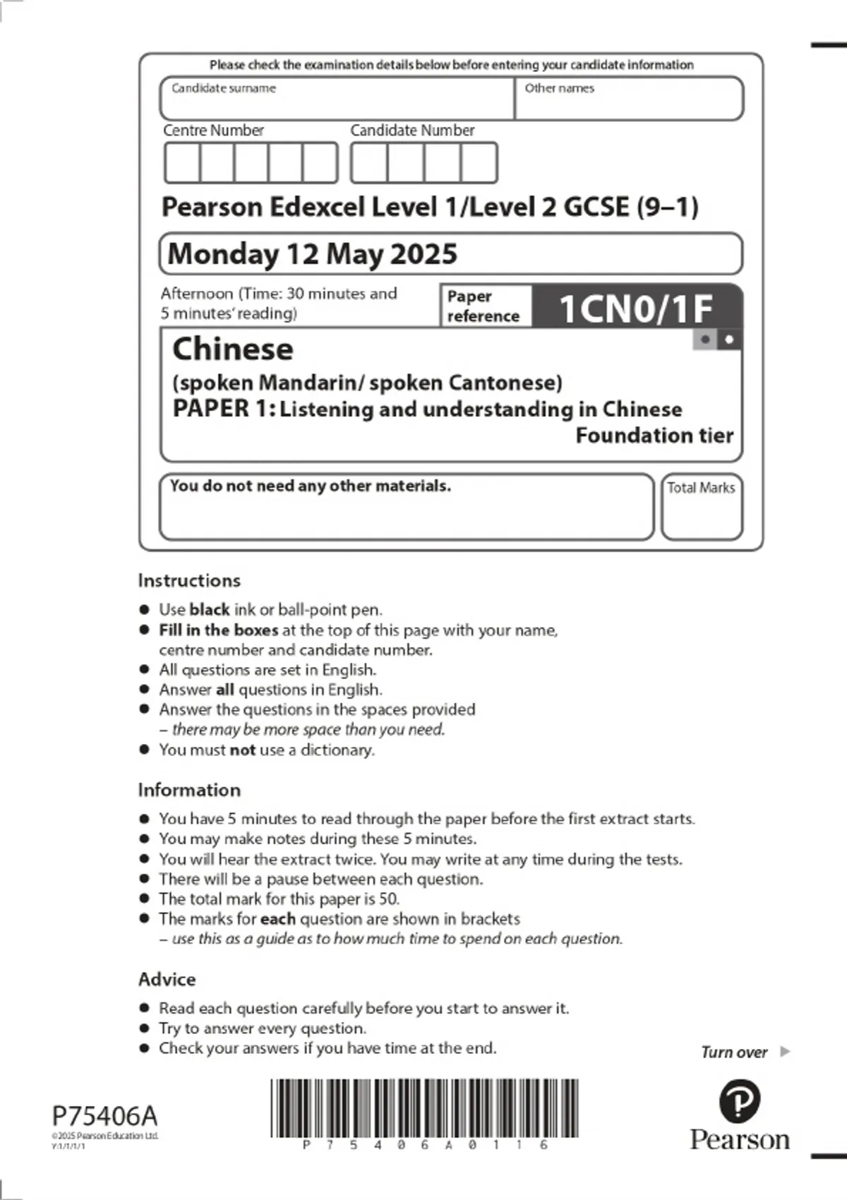 2025 Pearson Edexcel Level 1/Level 2 GCSE (9–1) Chinese (spoken Mandarin/ spoken Cantonese) PAPER 1: Listening and understanding in Chinese Foundation tier Combined Question Paper & Marking Scheme