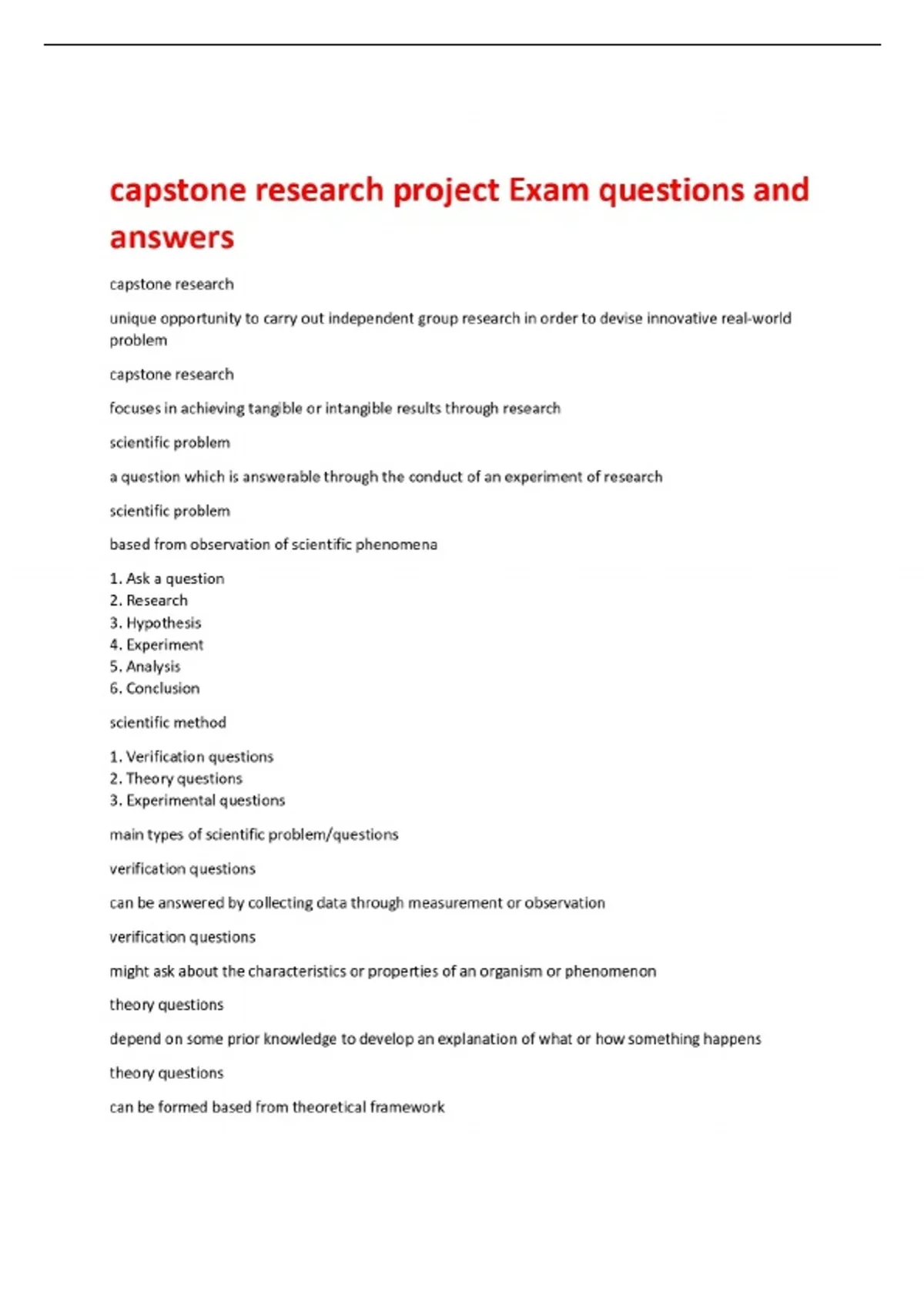 capstone research project Exam questions and answers capstone research unique opportunity to carry out independent group research in order to devise innovative real-world problem capstone research focuses in achieving tangible or intangible results through research scientific problem a question which is answerable through the conduct of an experiment of research scientific problem based from observation of scientific phenomena