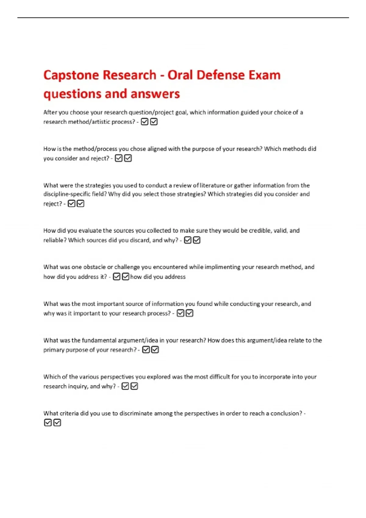 Capstone Research - Oral Defense Exam questions and answers After you choose your research question/project goal, which information guided your choice of a research method/artistic process? - How is the method/process you chose aligned with the purpose of your research? Which methods did you consider and reject? - What were the strategies you used to conduct a review of literature or gather information from the discipline-specific field? Why did you select those strategies? Which strategies did you consider and reject? -