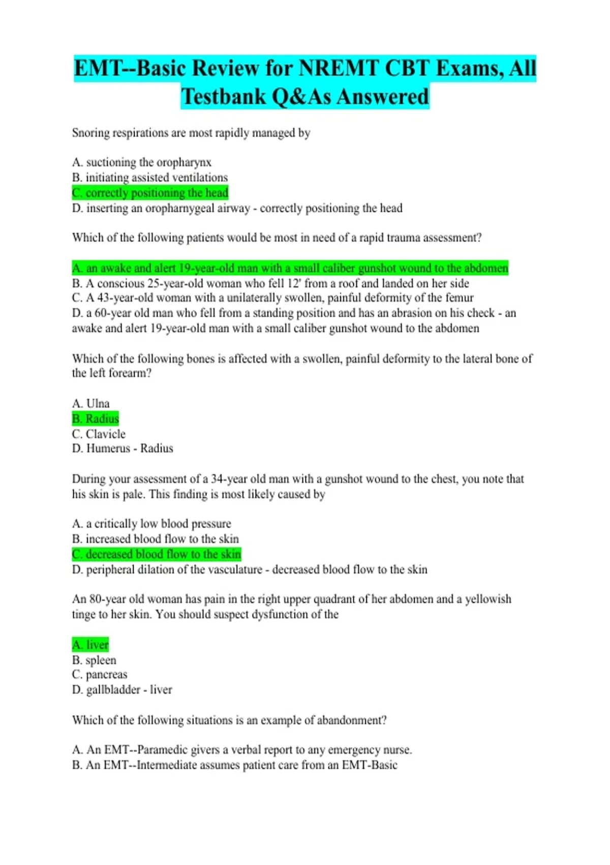 EMT Basic Review for NREMT CBT Exams All Testbank Q&A Answered Converted Version 2025/ 2026