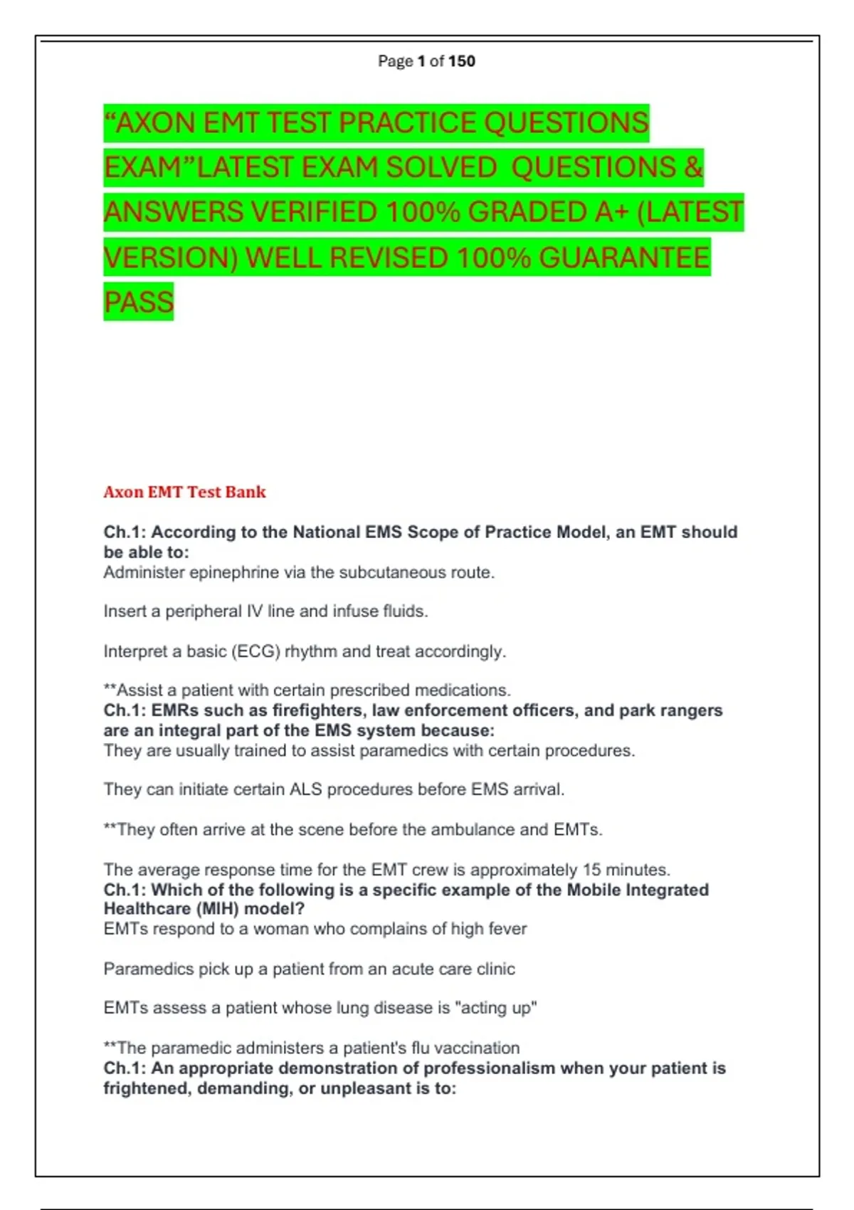 “AXON EMT TEST PRACTICE QUESTIONS EXAM”LATEST EXAM SOLVED QUESTIONS & ANSWERS VERIFIED 100% GRADED A+ (LATEST VERSION) WELL REVISED 100% GUARANTEE PASS