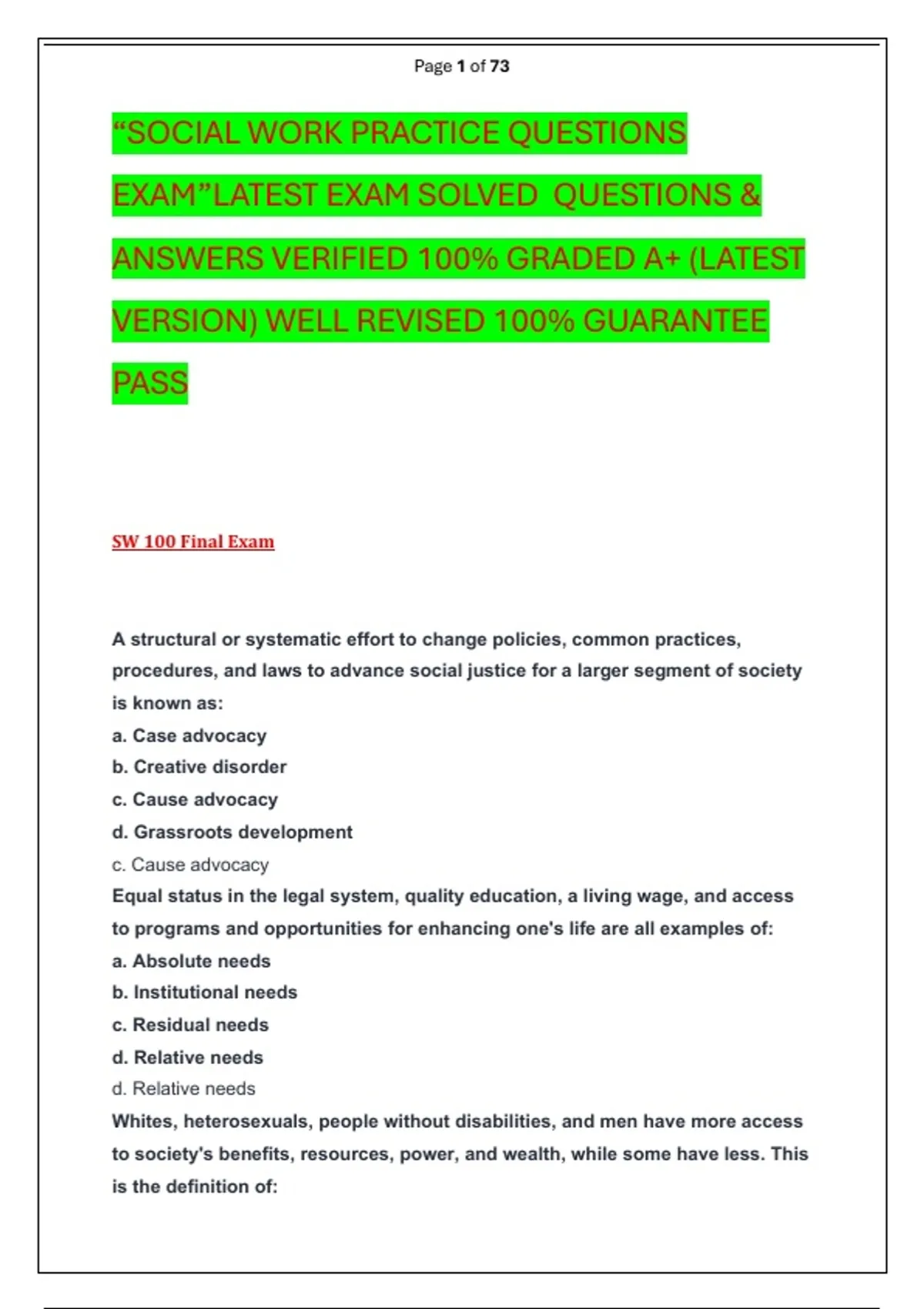 “SOCIAL WORK PRACTICE QUESTIONS EXAM”LATEST EXAM SOLVED QUESTIONS & ANSWERS VERIFIED 100% GRADED A+ (LATEST VERSION) WELL REVISED 100% GUARANTEE PASS