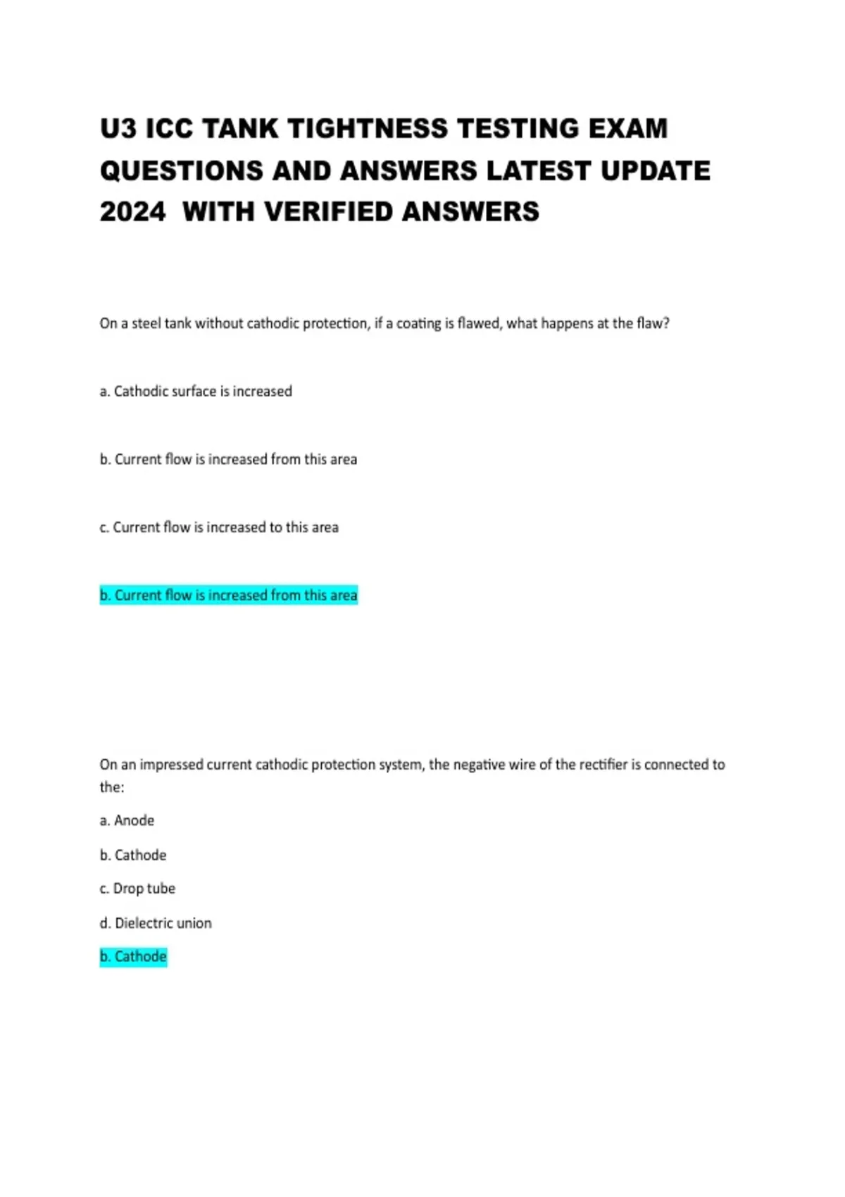 Comprehensive U3 ICC Tank Tightness Testing Exam Questions and Answers Latest Update 2025/ 2026 with solution, designed to help professionals master tank tightness testing procedures, reinforce understanding of ICC standards, improve practical inspection skills, and excel in certification exams through accurate, up-to-date practice questions with detailed explanations.
