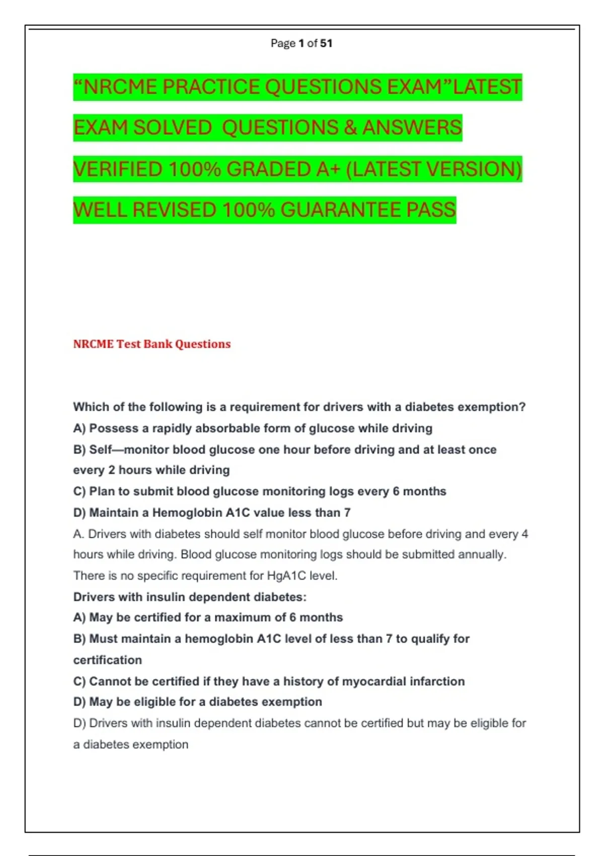 “NRCME PRACTICE QUESTIONS EXAM”LATEST EXAM SOLVED QUESTIONS & ANSWERS VERIFIED 100% GRADED A+ (LATEST VERSION) WELL REVISED 100% GUARANTEE PASS