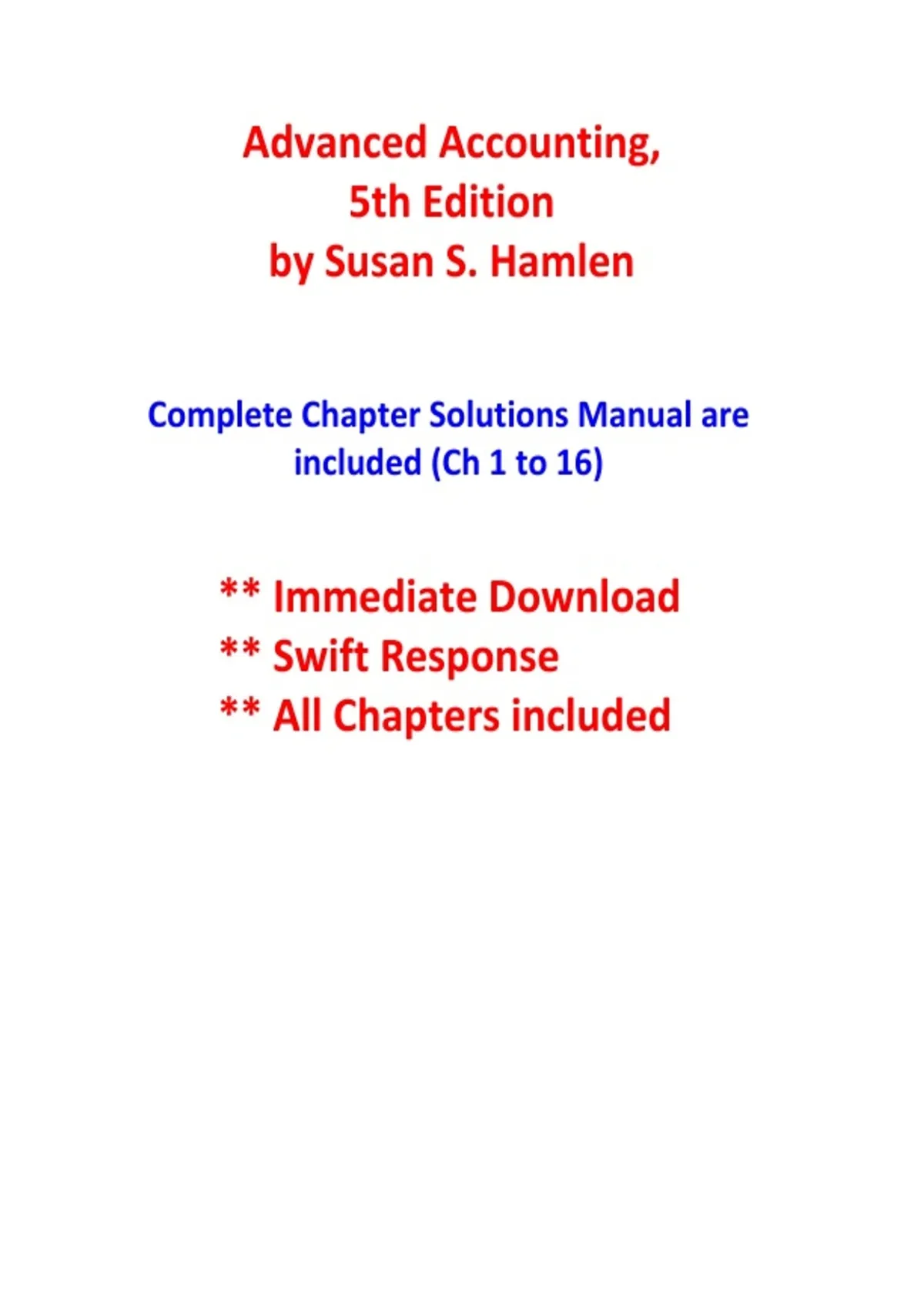 Comprehensive Solutions Manual Advanced Accounting 5th Edition Susan S. Hamlen Converted Version 2025/ 2026 with solution, designed to help students master advanced accounting concepts, accurately solve complex exercises in corporate, partnership, and managerial accounting, reinforce analytical and problem-solving skills, and excel in exams through step-by-step answers and detailed explanations.
