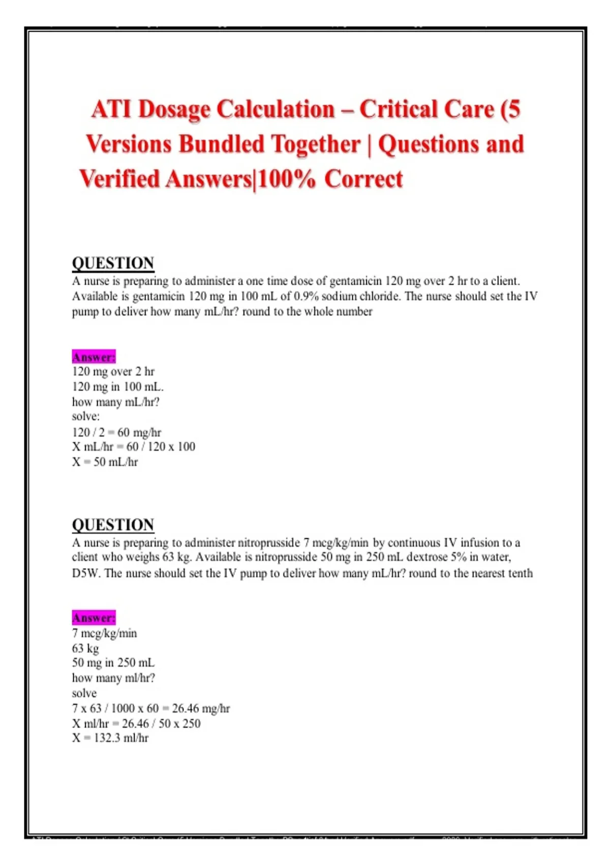 Prepare for ATI Dosage Calculation Critical Care exams with this 5-version bundled set of questions and verified answers 2025/2026 with solution, designed to improve calculation accuracy, reinforce key concepts, and boost exam performance.