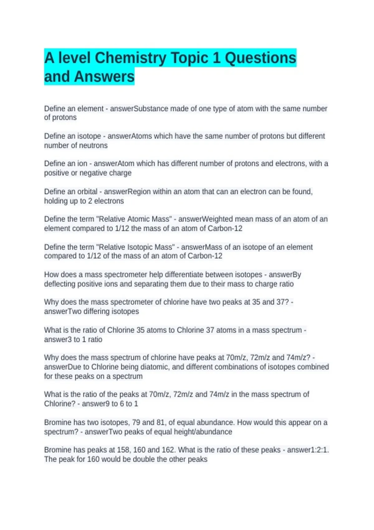 A level Chemistry Topic 1 Questions and Answers Define an element Substance made of one type of atom with the same number of protons Define an isotope Atoms which have the same number of protons but different number of neutrons Define an ion Atom which has different number of protons and electrons, with a positive or negative charge Define an orbital Region within an atom that can an electron can be found, holding up to 2 electrons Define the term "Relative Atomic Mass" Weighted mean mass of an atom of an element compared to 1/12 the mass of an atom of Carbon-12 Define the term "Relative Isotopic Mass" Mass of an isotope of an element compared to 1/12 of the mass of an atom of Carbon-12 How does a mass spectrometer help differentiate between isotopes By deflecting positive ions and separating them due to their mass to charge ratio Why does the mass spectrometer of chlorine have two peaks at 35 and 37? Two differing isotopes What is the ratio of Chlorine 35 atoms to Chlorine 37 atoms in a mass spectrum 3 to 1 ratio Why does the mass spectrum of chlorine have peaks at 70m/z, 72m/z and 74m/z? Due to Chlorine being diatomic, and different combinations of isotopes combined for these peaks on a spectrum What is the ratio of the peaks at 70m/z, 72m/z and 74m/z in the mass spectrum of Chlorine? 9 to 6 to 1 Bromine has two isotopes, 79 and 81, of equal abundance. How would this appear on a spectrum? Two peaks of equal height/abundance Bromine has peaks at 158, 160 and 162. What is the ratio of these peaks 1:2:1. The peak for 160 would be double the other peaks What shape is an s orbital? Spherical What shape is a p orbital? Dumb-bell What is the maximum no of electrons in the 1st quantum energy level? 2 What is the maximum no of electrons in the 2nd quantum energy level? 8 What is the maximum no of electrons in the 3rd quantum energy level? 18 What is the maximum no of electrons in the 4th quantum energy level? 32 How many s orbitals per quantum energy level? 1 orbital How many p orbitals per quantum energy level? 3 orbitals How many d orbitals per quantum energy level? 5 orbitals How many f orbitals per quantum energy level? 7 orbitals How many electrons occupy the s orbitals? 2 electrons How many total electrons occupy the p sub-shell? 6 electrons How many total electrons occupy the d sub-shell? 10 electrons How many total electrons occupy the f sub-shell? 14 electrons State the sub-shell order up to and including the 4p sub-shell 1s²2s²2p⁶3s²3p⁶4s²3d¹⁰4p⁶ Why does the 3d orbital fill up after the 4s sub-shell? The 4s sub-shell is at a lower quantum energy level than the 3d sub-shell so fills first Draw a spin diagram for Oxygen Teacher to draw on board Draw a spin diagram for Nitrogen Teacher to draw on board Define the "First Ionisation Energy" The energy required to remove one electron from each atom in one mole of gaseous atoms to form one mole of gaseous 1+ ions Give an equation for the 2nd ionisation energy of Lithium Li(g) → Li⁺(g) + e⁻ Which three factors affect ionisation energy? Nuclear Charge, Electron Sub-Shell Distance and Electron Shielding How does ionisation energy change across a period? Increases across a period How does ionisation energy change down a group? Decreases down a group Where does evidence for differing energy levels in atoms come from? Emission Spectra When electrons are given energy, what happens to them? Excited, move to higher energy levels When electrons release this energy, what is emitted? Electromagnetic Radiation What is meant by the term s-block element? Element whose valence electron is within a s orbital What is meant by the term p-block element? Element whose valence electron is within a p orbital What is meant by the term f-block element? Element whose valence electron is within an f orbital What is meant by the term d-block element? Element whose valence electron is within a d orbital Explain why the chemical properties of Group 1 elements are similar Same number of valence electrons An element has the configuration 1s²2s²2p², which element is it and which block is it in? Carbon; p block Explain what is meant by the term periodicity Repeating pattern of properties across differing periods in the Periodic Table How does atomic radii vary across a Period? Radius decreases across a period How does boiling and melting point vary across a Period? Melting and Boiling Point generally increase then decrease across a period Why does atomic radii vary across a Period? Increased number of protons, so increased nuclear charge. Increased attraction between nucleus and furthest electrons Why does melting and boiling point vary across a Period? Changes in the type of bonding and type of structure as you move across a period. Why does Oxygen have a lower ionisation energy than Nitrogen? Oxygen has two paired electrons in one orbital, increases electron-electron repulsion, so less energy needed to remove one Explain why the first ionisation energy of helium is higher than hydrogen Helium has a greater nuclear charge than hydrogen, whilst electrons and a similar distance away from the nucleus in 1s orbital. Similar amount of electron shielding occurs Explain why the first ionisation energy of lithium is lower than helium Despite the higher nuclear charge due to more protons, lithium's valence electron is in the 2s orbital, a greater distance from nucleus and experiences more electron shielding