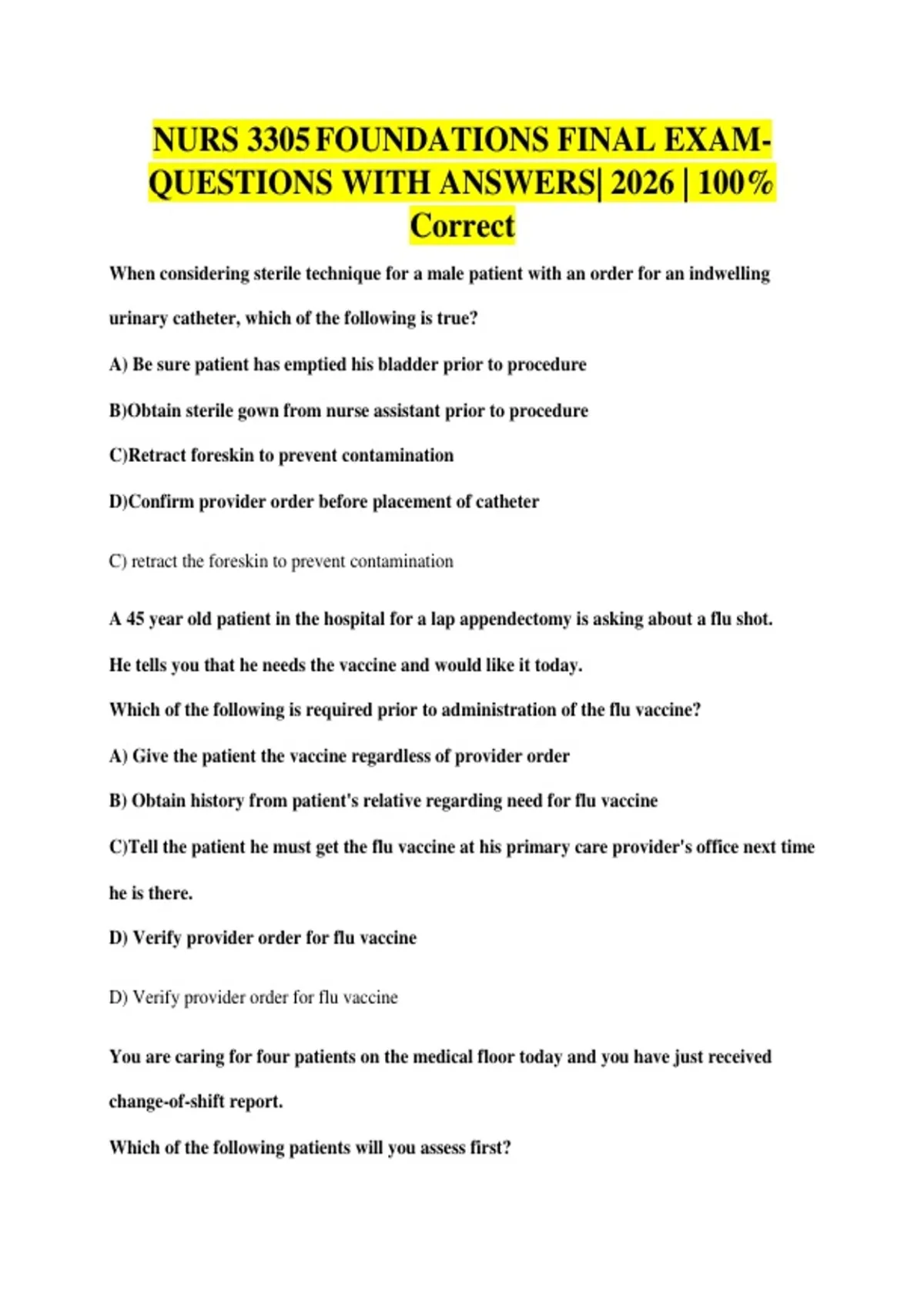 NURS 3305 FOUNDATIONS FINAL EXAM- QUESTIONS WITH ANSWERS| 2026 | 100% Correct
