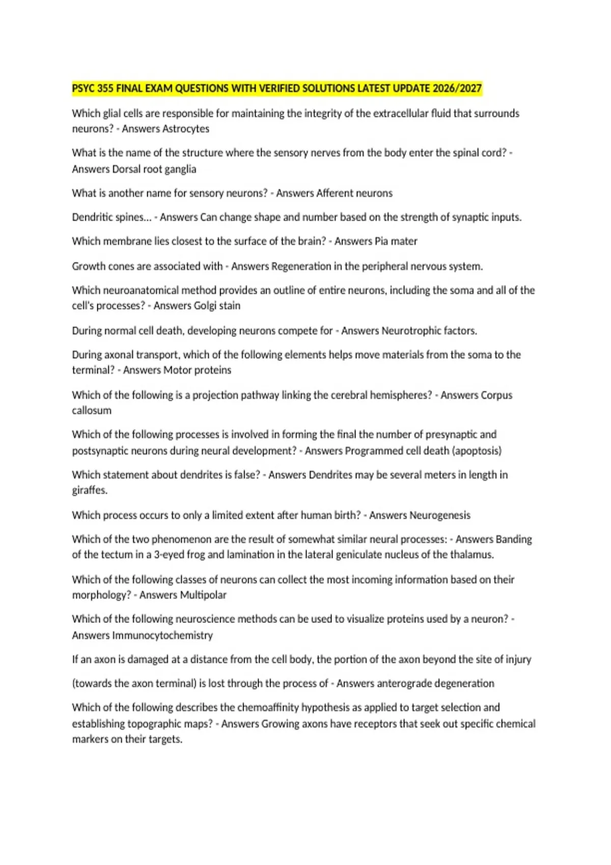 PSYC 355 FINAL EXAM QUESTIONS WITH VERIFIED SOLUTIONS LATEST UPDATE 2026/2027 Which glial cells are responsible for maintaining the integrity of the extracellular fluid that surrounds neurons? - Answers Astrocytes What is the name of the structure where the sensory nerves from the body enter the spinal cord? - Answers Dorsal root ganglia What is another name for sensory neurons? - Answers Afferent neurons Dendritic spines... - Answers Can change shape and number based on the strength of synaptic inputs. Which membrane lies closest to the surface of the brain? - Answers Pia mater Growth cones are associated with - Answers Regeneration in the peripheral nervous system. Which neuroanatomical method provides an outline of entire neurons, including the soma and all of the cell's processes? - Answers Golgi stain During normal cell death, developing neurons compete for - Answers Neurotrophic factors. During axonal transport, which of the following elements helps move materials from the soma to the terminal? - Answers Motor proteins Which of the following is a projection pathway linking the cerebral hemispheres? - Answers Corpus callosum Which of the following processes is involved in forming the final the number of presynaptic and postsynaptic neurons during neural development? - Answers Programmed cell death (apoptosis) Which statement about dendrites is false? - Answers Dendrites may be several meters in length in giraffes. Which process occurs to only a limited extent after human birth? - Answers Neurogenesis Which of the two phenomenon are the result of somewhat similar neural processes: - Answers Banding of the tectum in a 3-eyed frog and lamination in the lateral geniculate nucleus of the thalamus. Which of the following classes of neurons can collect the most incoming information based on their morphology? - Answers Multipolar Which of the following neuroscience methods can be used to visualize proteins used by a neuron? - Answers Immunocytochemistry If an axon is damaged at a distance from the cell body, the portion of the axon beyond the site of injury (towards the axon terminal) is lost through the process of - Answers anterograde degeneration Which of the following describes the chemoaffinity hypothesis as applied to target selection and establishing topographic maps? - Answers Growing axons have receptors that seek out specific chemical markers on their targets. Multiple cell types, including neurons and glia, can arise from the same precursor cells. These precursor cells are also called which of the following? - Answers Multipotent stem cells The major function of Schwann cells is the - Answers Myelination of peripheral nerve fibers. What structure produces cerebrospinal fluid (CSF)? - Answers Choroid plexus Migrating neurons are guided during early development by - Answers Radial glia. The ventral roots of the spinal cord carry - Answers Motor information to muscles. The ability of the brain to be changed by environmental inputs throughout the life span is called - Answers Plasticity. What is retrograde axoplasmic transport? - Answers Movement of material from axon terminal to soma. What is one of the major differences between MRI and CT scanning? - Answers MRI uses magnetic fields whereas CT scanning uses x-rays. What is the name of the region where the axon begins? - Answers The axon hillock. Axons use chemoattractants and chemorepellants to guide their direction of movement by - Answers following a gradient of concentration of those substances In multiple sclerosis myelin in is lost, but there can be some recovery. If possible, which cells would be most likely involved in replacing lost myelin in the spinal cord? - Answers Oligodendrocytes. Evidence shows that in _______ whose optic nerve has been damaged, _______. - Answers adult frogs; the retinal axons will grow back to their original positions on the tectum Synaptic vesicles are found in the - Answers synaptic boutons
