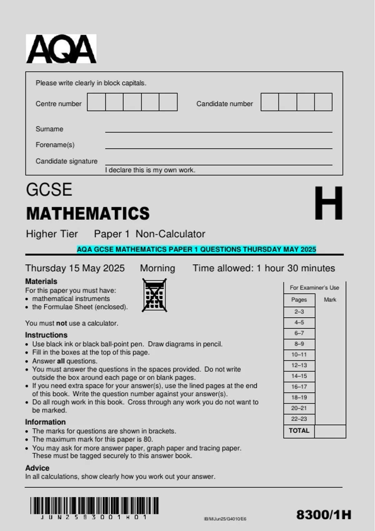 AQA GCSE MATHEMATICS PAPER 1 QUESTIONS THURSDAY MAY 2025