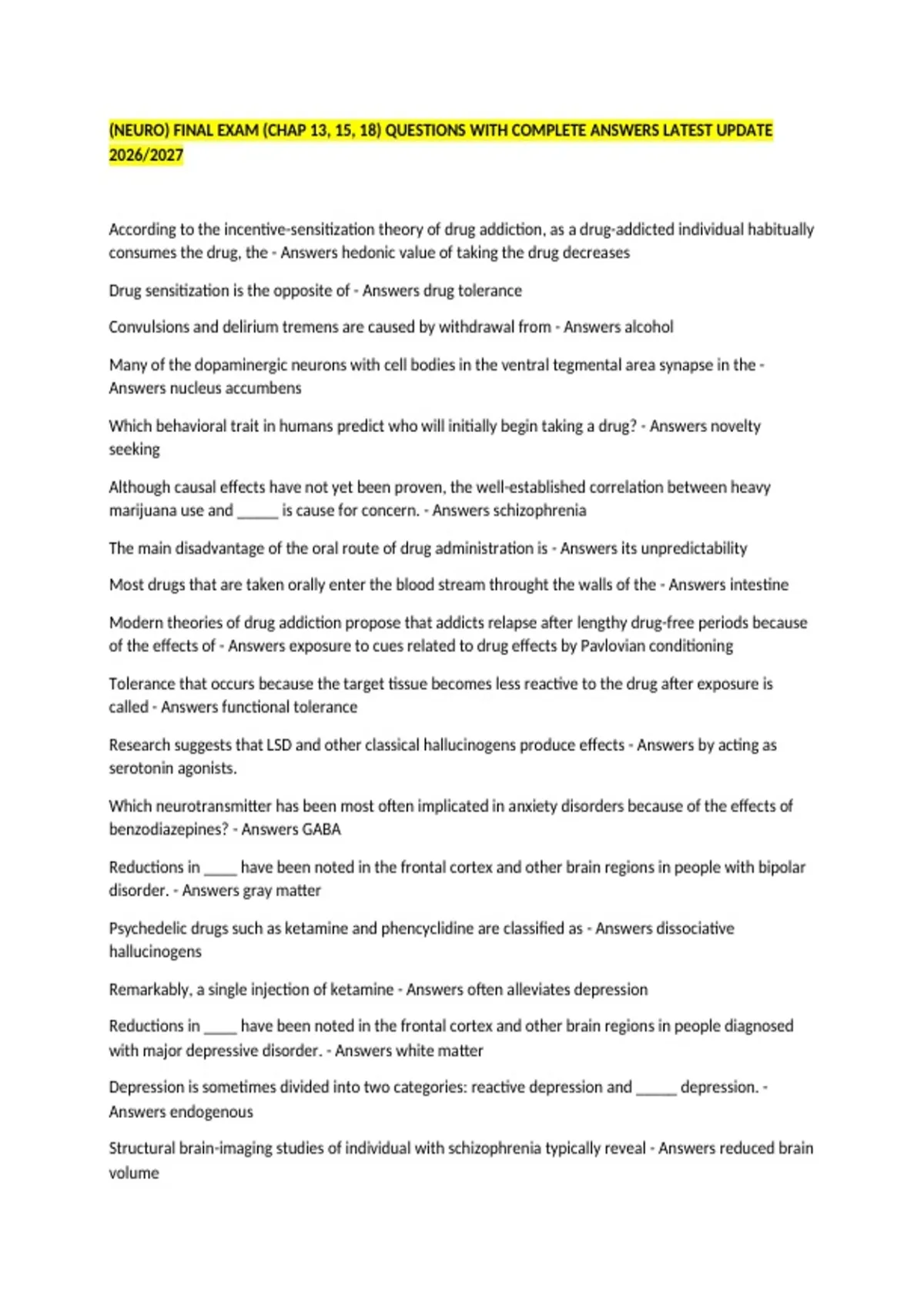 (NEURO) FINAL EXAM (CHAP 13, 15, 18) QUESTIONS WITH COMPLETE ANSWERS LATEST UPDATE 2026/2027