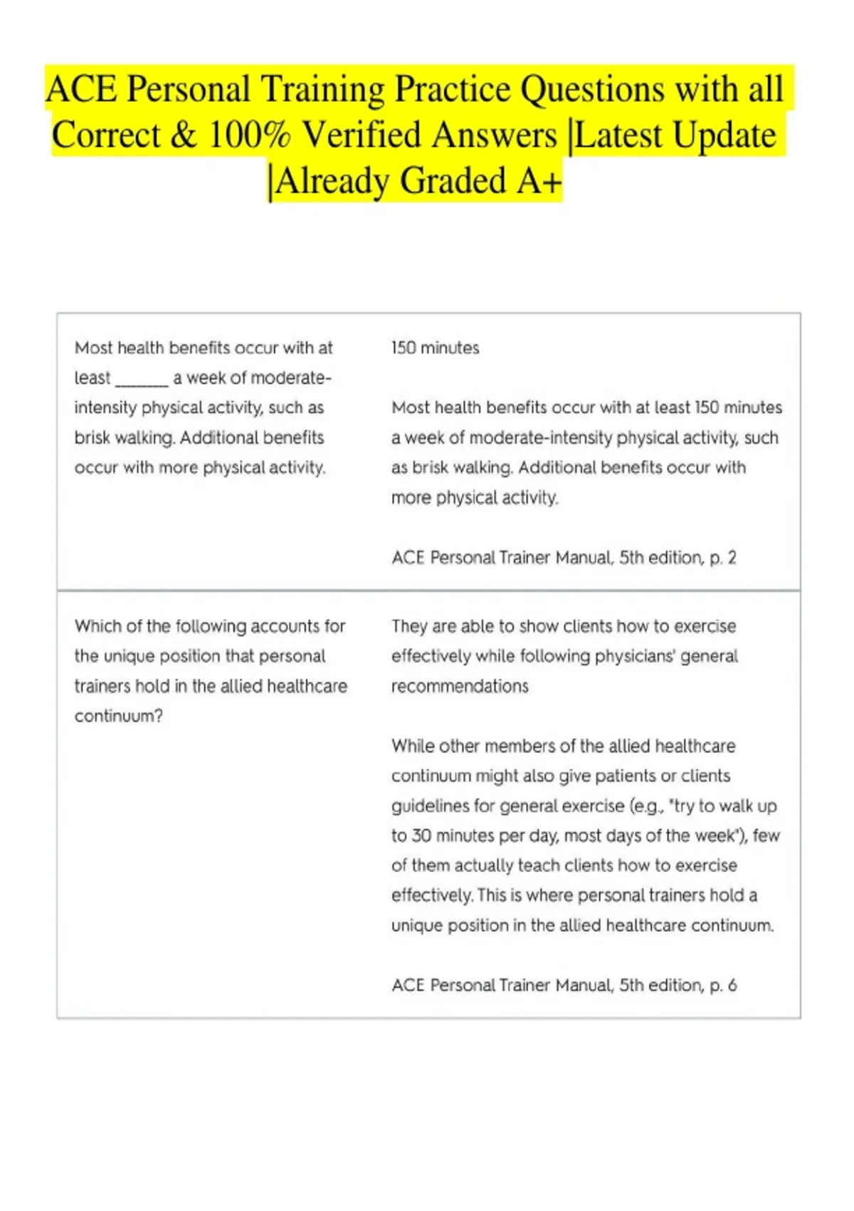 ACE Personal Training Practice Questions with all Correct & 100% Verified Answers |Latest Update |Already Graded A+
