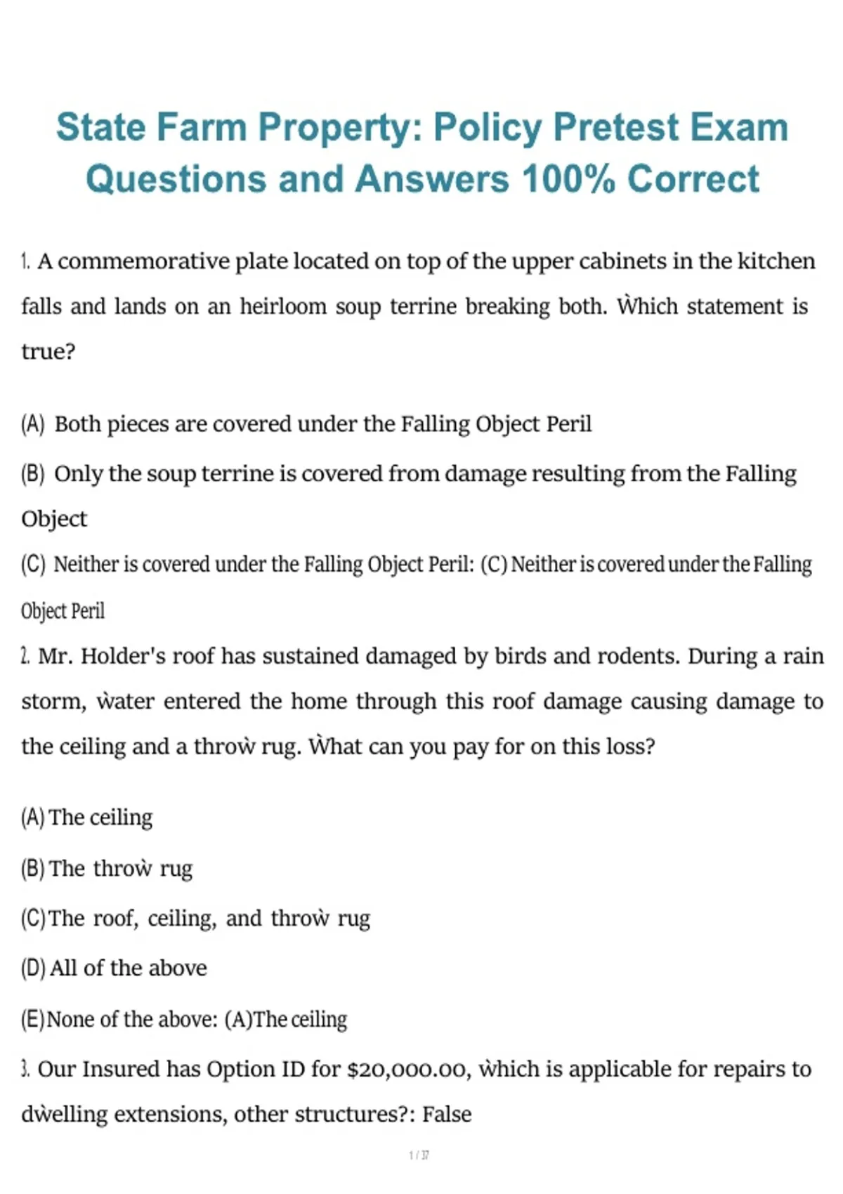 This document provides State Farm Property Policy pretest exam questions with fully verified answers rated 100% correct. It covers key property insurance concepts including policy structure, coverage types, exclusions, endorsements, conditions, and basic claims principles commonly assessed in pretest evaluations. The material is designed for focused review, self-testing, and confident preparation before the official exam.