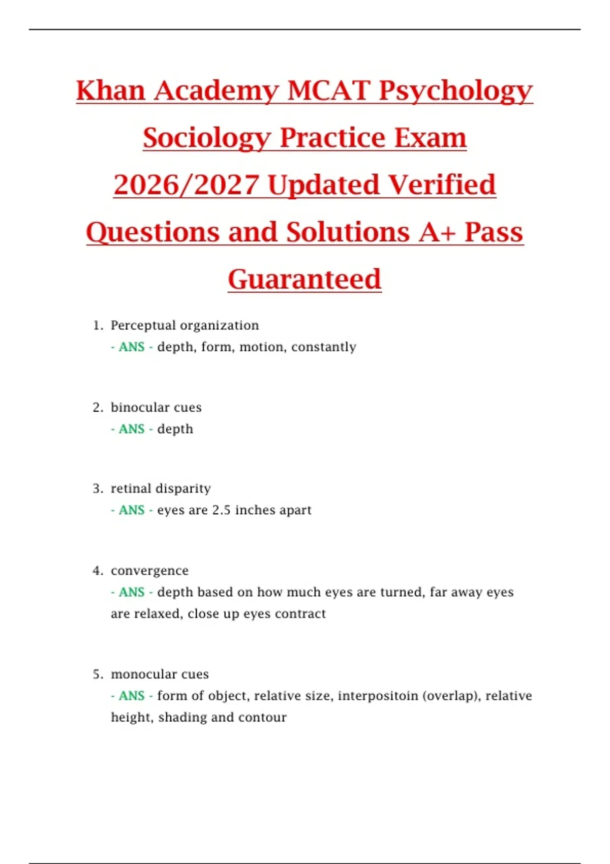 This document contains Khan Academy-aligned MCAT Psychology and Sociology practice questions with updated and verified answers for the 2026–2027 academic year. It covers high-yield behavioral science topics, including cognition, learning, memory, emotion, identity, and social processes, providing targeted practice and detailed solutions to enhance exam readiness.