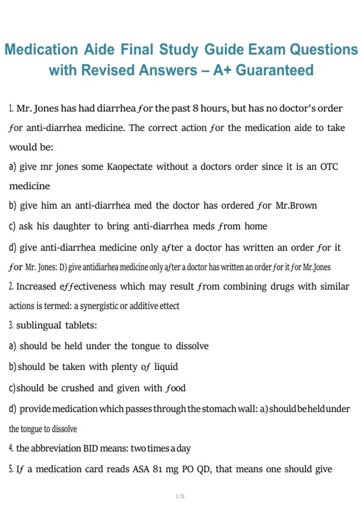 Medication Aide Final Study Guide Exam – Practice Questions with Revised Answers | A+ Guaranteed