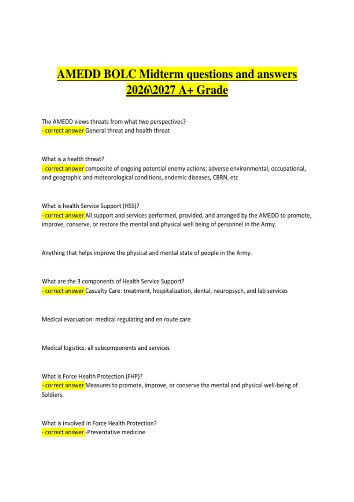 This study guide is designed for the AMEDD Basic Officer Leader Course (BOLC) Midterm Exam and covers key topics including Army medical doctrine, leadership principles, ethics, medical readiness, operational medicine, force health protection, and AMEDD organizational structure. It includes midterm-style questions with clear, accurate answers to support effective preparation for the 2026–2027 training cycle. The material is structured to reinforce essential knowledge, strengthen decision-making skills, and help officers achieve an A+ grade.