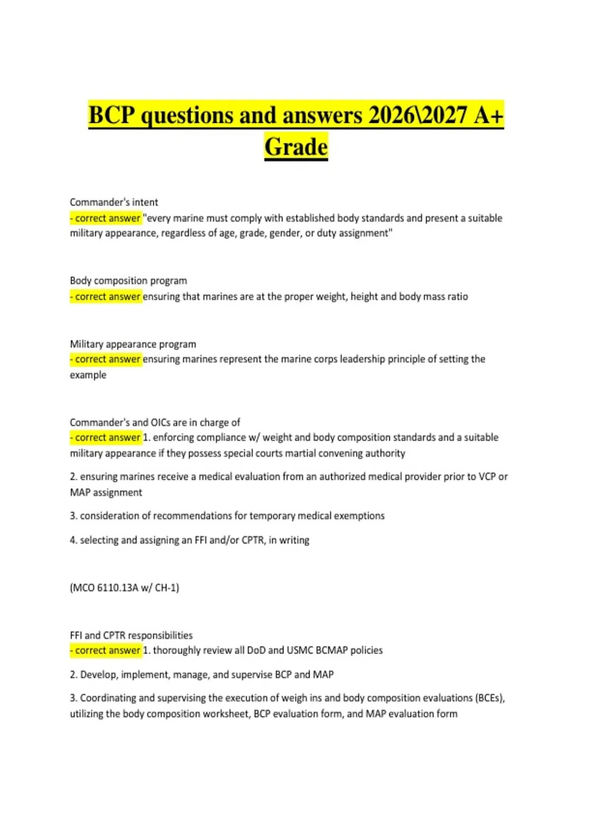 This study guide covers the Army Body Composition Program (BCP), including topics such as Army body composition standards, assessment procedures, height-weight charts, body fat calculations, compliance requirements, physical fitness standards, and corrective actions. It includes exam- and scenario-style questions with clear, verified answers to support effective preparation for the 2026–2027 training cycle. The material is structured to reinforce understanding of Army physical readiness policies, evaluation procedures, and program compliance, helping Soldiers achieve an A+ grade.
