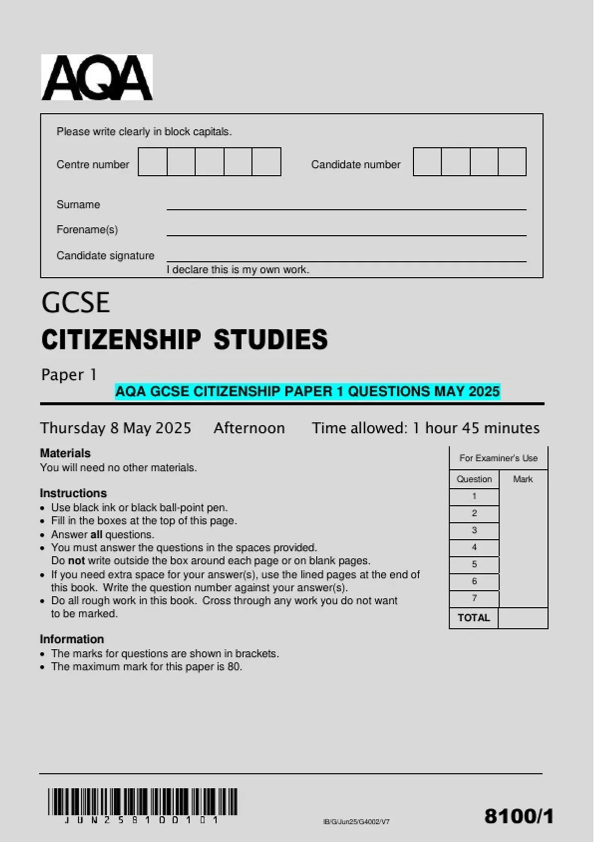 AQA GCSE CITIZENSHIP PAPER 1 QUESTIONS MAY 2025