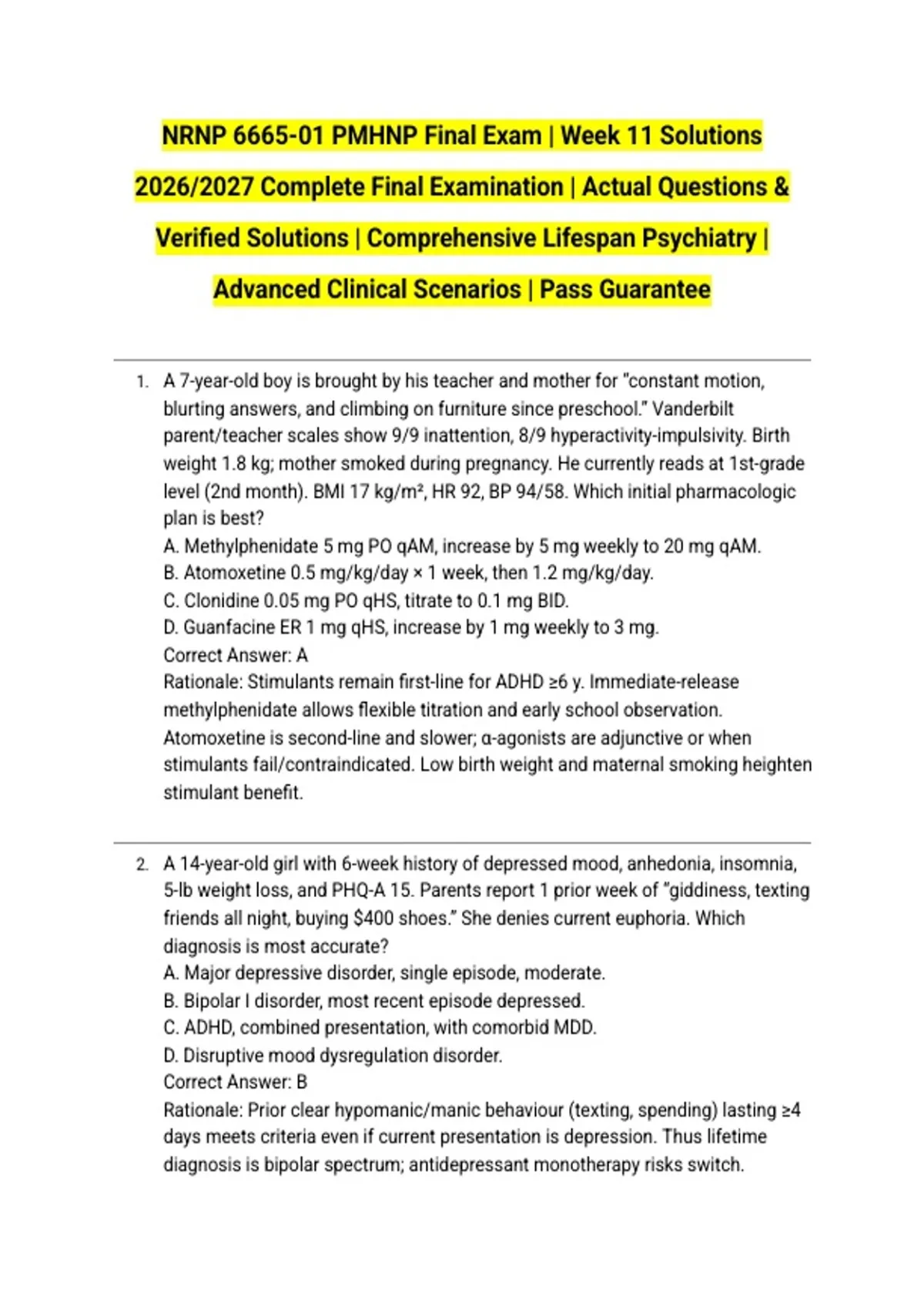 NRNP 6665-01 PMHNP Final Exam | Week 11 Solutions 2026/2027 Complete Final Examination | Actual Questions & Verified Solutions | Comprehensive Lifespan Psychiatry | Advanced Clinical Scenarios | Pass Guarantee