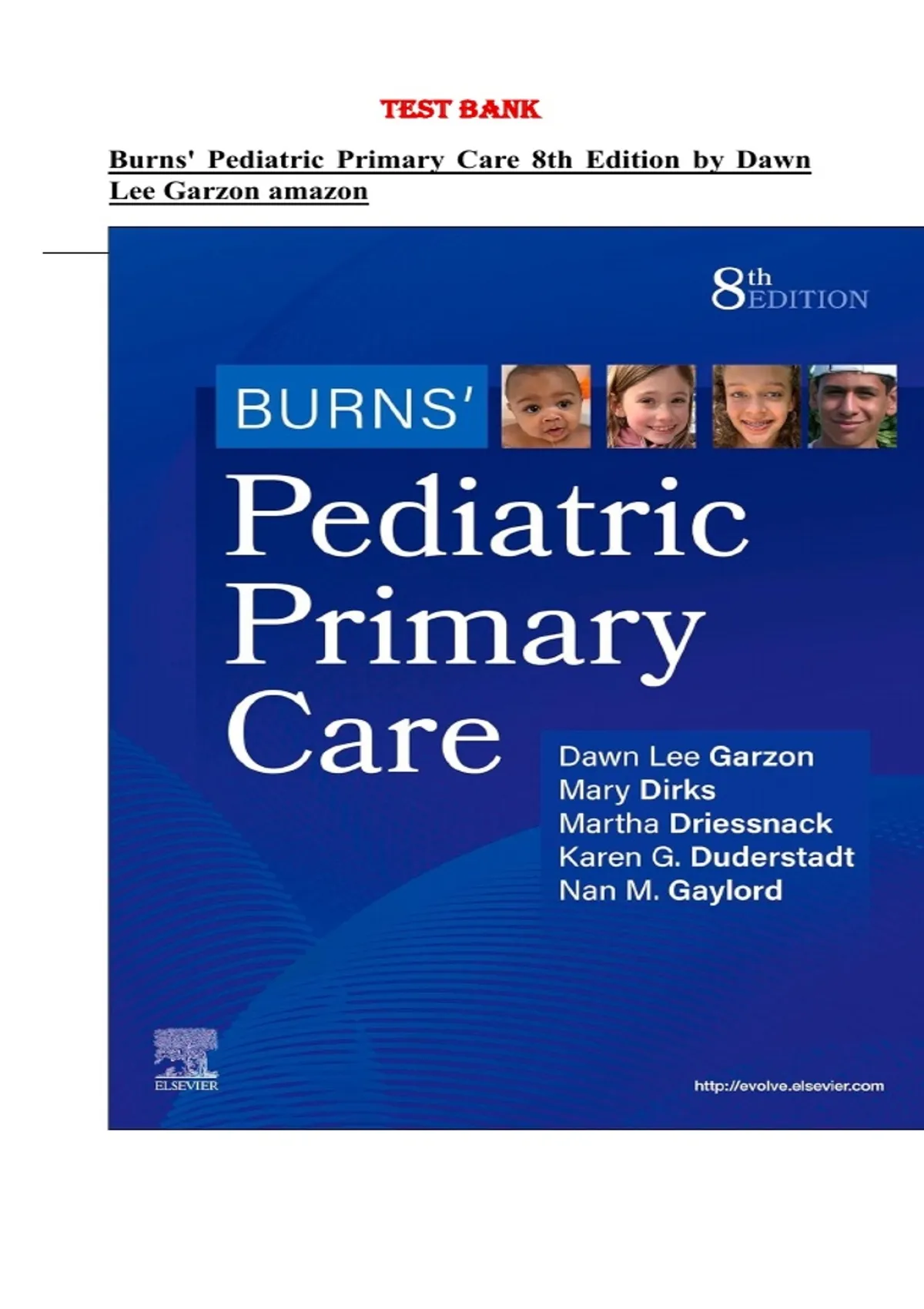 Test Bank for Burns’ Pediatric Primary Care, 8th Edition by Dawn Lee Garzon – Complete and Updated Coverage. This test bank for Burns’ Pediatric Primary Care, 8th Edition by Dawn Lee Garzon provides comprehensive, chapter-by-chapter questions covering pediatric assessment, preventive care, common illnesses, chronic conditions, and family-centered nursing interventions. Designed to support exam preparation, concept reinforcement, and practical application, it ensures full coverage of all chapters for effective mastery of pediatric primary care concepts.