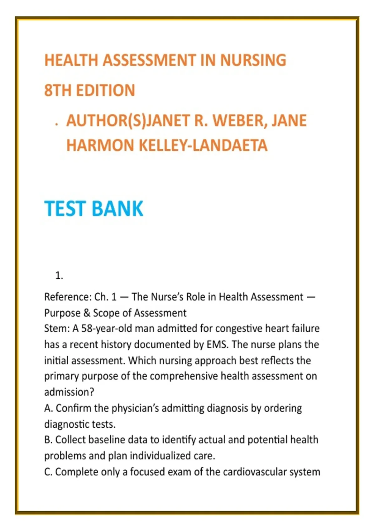 Health Assessment in Nursing 8e: Chapter Study Guide & Practice Question Bank Product Description (160–220 words) This comprehensive study resource is a chapter-by-chapter study guide and practice question bank aligned with Health Assessment in Nursing, 8th Edition by Janet R. Weber and Jane Harmon Kelley-Landaeta. It is designed to support ethical learning, clinical reasoning, and safe nursing practice—not to provide leaked exams or test answers. The guide walks you through core health assessment concepts using clear summaries, focused health-history prompts, and structured review points that reinforce head-to-toe and system-focused examination skills. Practice questions are written in a nursing-assessment style, emphasizing subjective vs. objective data collection, normal vs. abnormal findings, prioritization, and documentation—key skills for OSCEs, simulations, and NCLEX-style exams. Each practice item includes detailed rationales to strengthen clinical judgment and help you understand why an answer is correct, not just what to choose. Content reflects evidence-based best practices in nursing health assessment, patient-centered care, and professional documentation, making it suitable for ADN, BSN, and MSN students, as well as clinical skills refreshers. Integrity & recommended use: This resource is for personal study and skills development only. It must not be used for cheating, exam substitution, or redistribution. Download now and study health assessment with confidence, clarity, and professionalism. Key Features Chapter-aligned summaries based on Health Assessment in Nursing, 8th Edition Head-to-toe and system-focused assessment review OSCE-style and NCLEX-style practice questions Subjective & objective data interpretation Detailed rationales to build clinical judgment Suitable for ADN, BSN, and MSN learners Format & Delivery PDF study guide + practice questions • Immediate digital download Hashtags #HealthAssessment #NursingStudyGuide #BSNNursing #ADNNursing #MSNStudent #NursingOSCE #NCLEXPrep #ClinicalSkills #NursingEducation #EvidenceBasedNursing