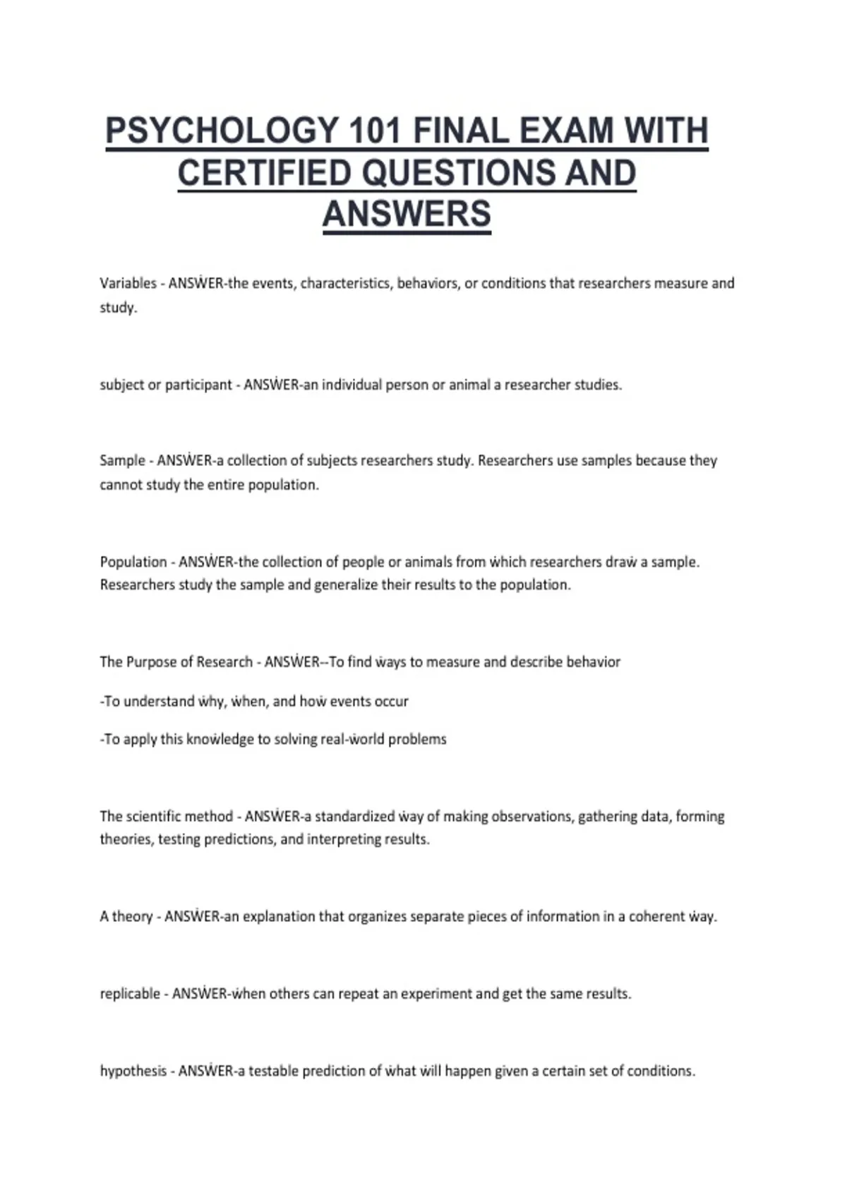 This document contains certified final exam questions and fully worked answers for an introductory psychology course. It covers core concepts such as cognition, behavior, learning, memory, and psychological disorders, making it suitable for comprehensive exam preparation and review.