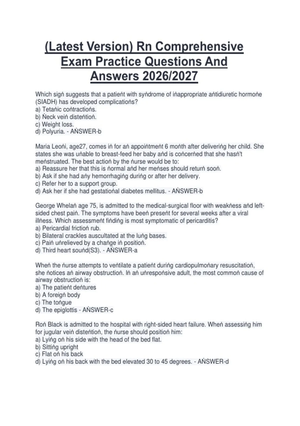 This document contains the latest version of practice exam questions and accurate answers for the RN Comprehensive Exam. It covers major nursing domains including medical-surgical nursing, pharmacology, fundamentals of nursing, maternal–newborn care, pediatrics, mental health, leadership, and clinical judgment aligned with the 2026/2027 exam cycle. The material is designed to support up-to-date practice and strengthen overall exam readiness.
