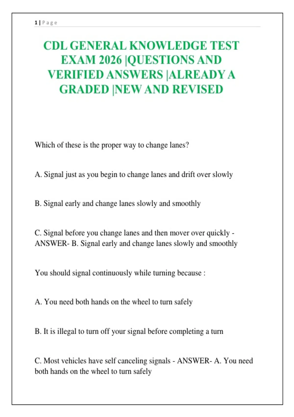 CDL GENERAL KNOWLEDGE TEST EXAM 2026 |QUESTIONS AND VERIFIED ANSWERS |ALREADY A GRADED |NEW AND REVISED