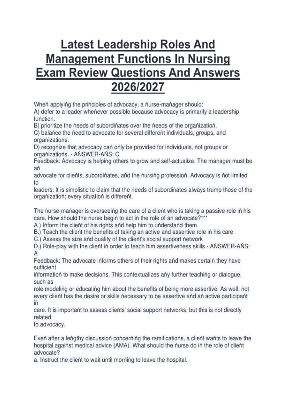 This exam review contains the latest questions and accurate answers on leadership roles and management functions in nursing. It covers essential topics including leadership styles, delegation, prioritization, conflict resolution, team management, communication strategies, and organizational principles relevant to the 2026/2027 exam cycle. The material is designed to support structured review and ensure effective preparation for nursing leadership and management exams.