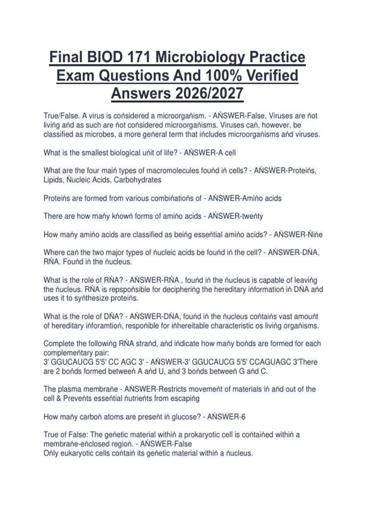 This document contains final practice exam questions with 100% verified answers for BIOD 171 Microbiology. It covers core topics including cell structure and function, microbial genetics, microbial growth and metabolism, pathogens, immunology, and infection control relevant to the 2026/2027 academic year. The material is designed to support hands-on practice and ensure complete readiness for the microbiology final exam.