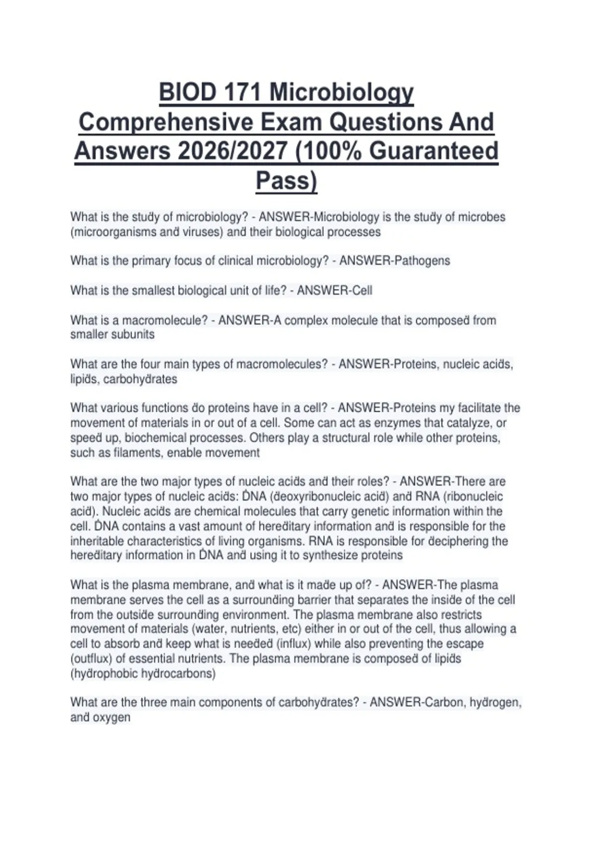 This document contains comprehensive exam questions and accurate answers for BIOD 171 Microbiology, designed to ensure complete readiness. It covers all essential topics including cell structure and function, microbial genetics, microbial growth and metabolism, pathogens, immunology, and infection control relevant to the 2026/2027 academic year. The material is designed to support thorough exam preparation and guarantee mastery of microbiology concepts.