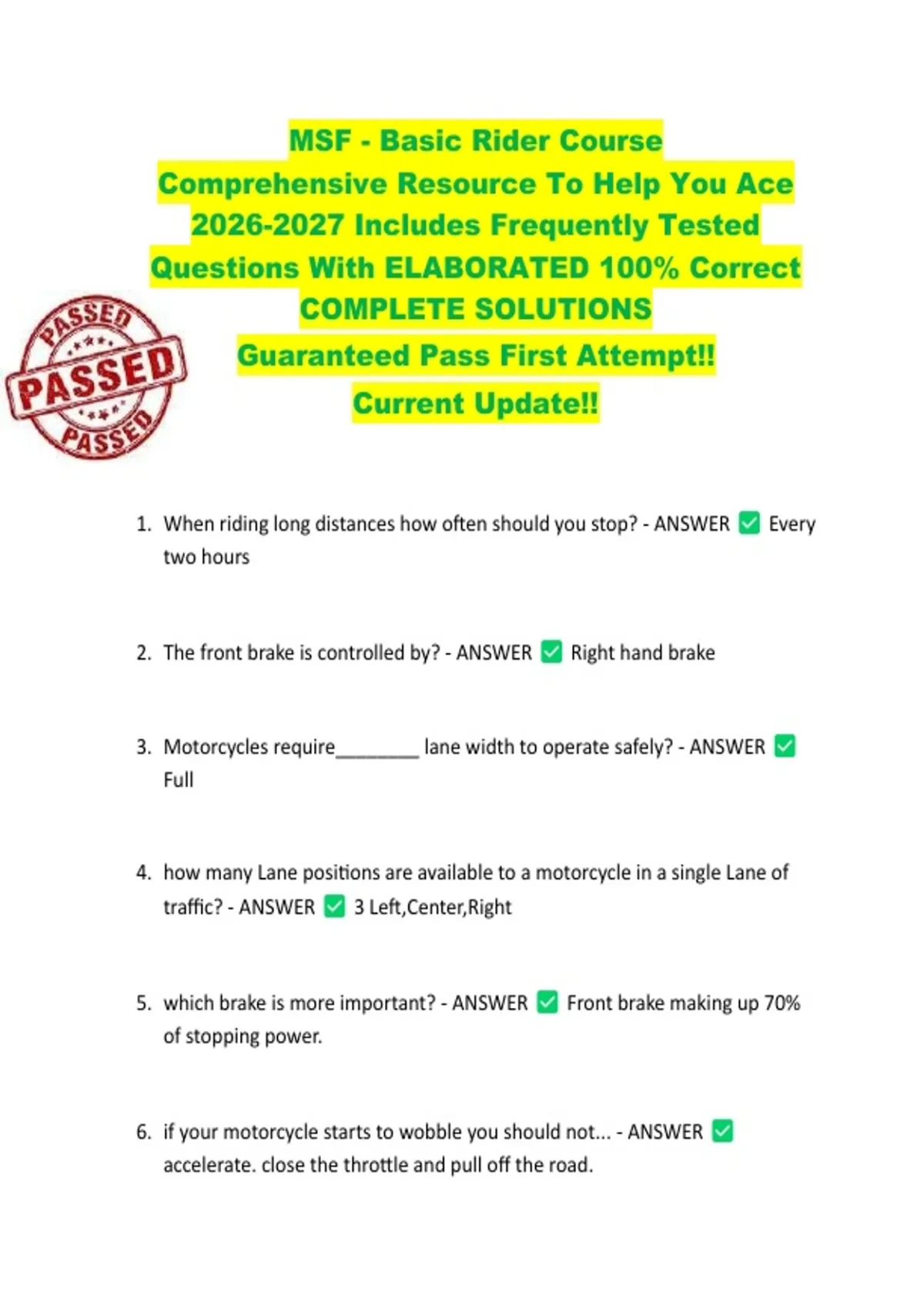 MSF - Basic Rider Course Comprehensive Resource To Help You Ace Includes Frequently Tested Questions With ELABORATED 100% Correct COMPLETE SOLUTIONS Guaranteed Pass First Attempt!! Current Update!! 1. When riding long distances how often should you stop? - ANSWER Every two hours 2. The front brake is controlled by? - ANSWER Right hand brake 3. Motorcycles require________ lane width to operate safely? - ANSWER Full 4. How many Lane positions are available to a motorcycle in a single Lane of traffic? - ANSWER 3 Left,Center,Right 5. which brake is more important? - ANSWER Front brake making up 70% of stopping power. 6. if your motorcycle starts to wobble you should not... - ANSWER accelerate. close the throttle and pull off the road. 7. which is the best position for being seen? - ANSWER No position. Move to where you are visible. 8. if your front tire fails while you're driving you should... - ANSWER Shift your weight to the rear. 9. When turning a motorcycle what should you avoid? - ANSWER Deceleration 10. in Texas if your motorcycle was manufactured since 1975... - ANSWER You have to drive with your headlights on.