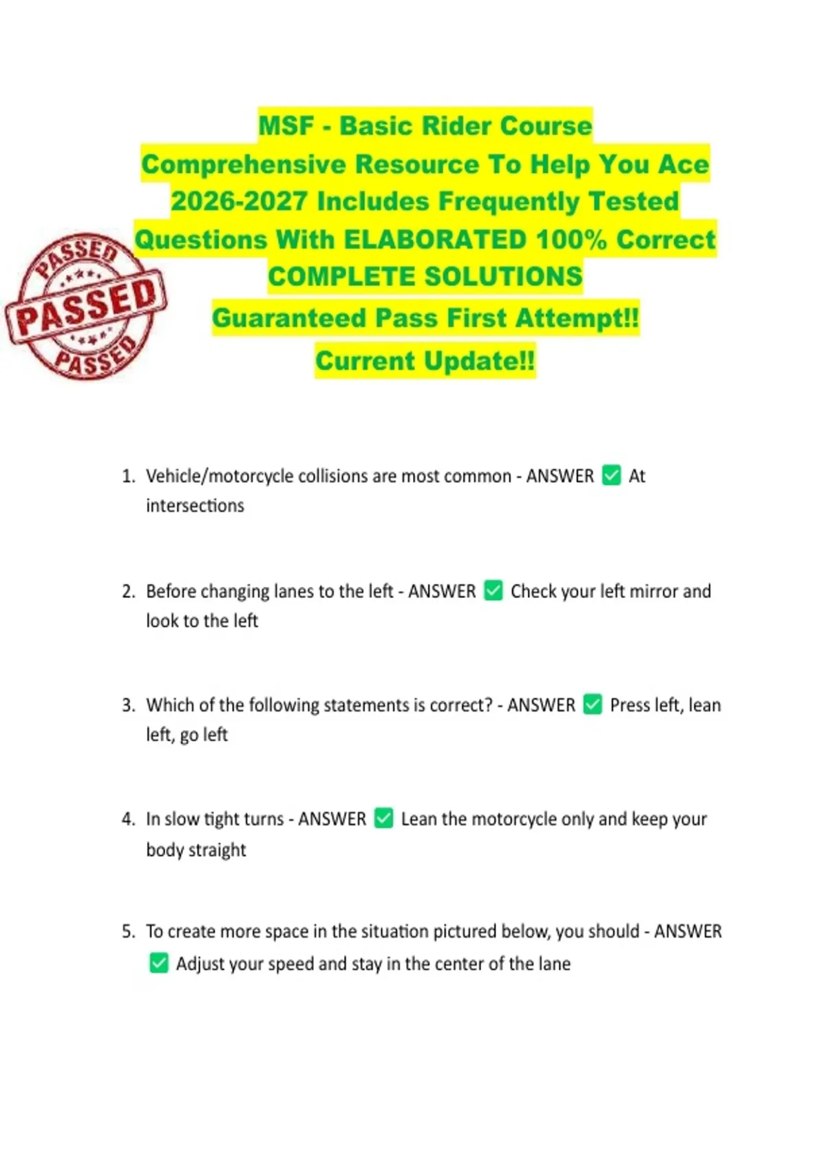 MSF - Basic Rider Course Comprehensive Resource To Help You Ace Includes Frequently Tested Questions With ELABORATED 100% Correct COMPLETE SOLUTIONS Guaranteed Pass First Attempt!! Current Update!! 1. Vehicle/motorcycle collisions are most common - ANSWER At intersections 2. Before changing lanes to the left - ANSWER Check your left mirror and look to the left 3. Which of the following statements is correct? - ANSWER Press left, lean left, go left 4. In slow tight turns - ANSWER Lean the motorcycle only and keep your body straight 5. To create more space in the situation pictured below, you should - ANSWER Adjust your speed and stay in the center of the lane 6. While in a turn, it is best to - ANSWER Maintain a steady speed or gradually accelerate 7. To make good judgments in traffic, you need to first - ANSWER Search ahead 8. Your motorcycle has two brakes. Use both brakes - ANSWER Every time you slow or stop. 9. When riding with a passenger, you should - ANSWER Start slowing sooner 10. When swerving, it is important to - ANSWER Separate braking from swerving 11. In the picture below, the car driver is preparing to enter the intersection. To be seen and maintain a space cushion, you should - ANSWER Slow down and move away from the vehicle after entering the intersection